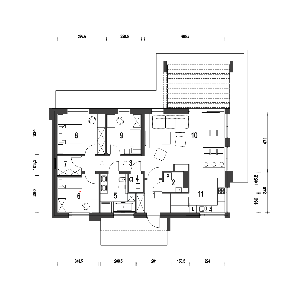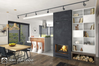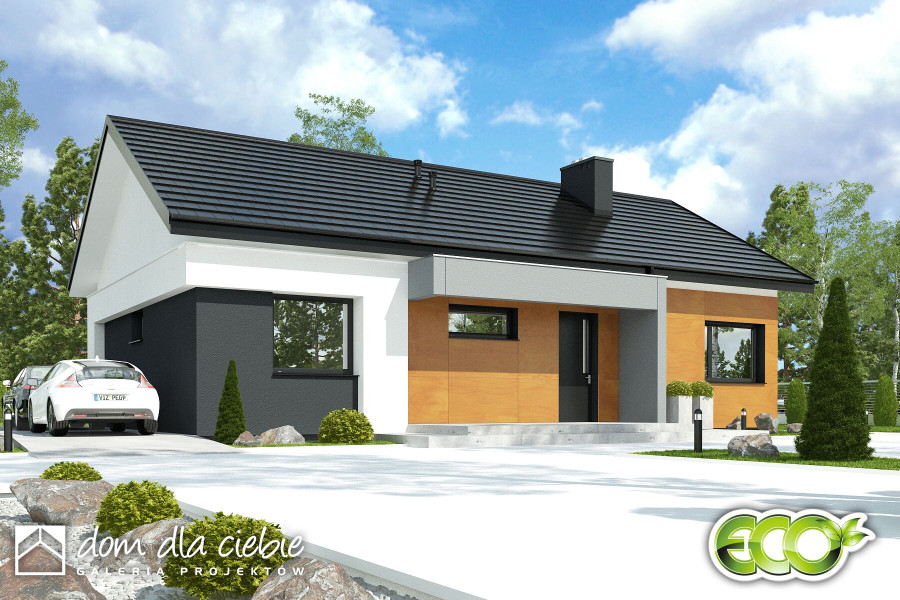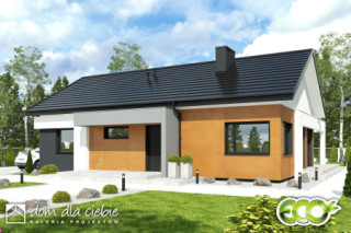 Projekt domu Kalikst bez garażu to nowoczesny dom dla 4-5cio osobowej rodziny. Budynek zaprojektowano w technologii murowanej z prefabrykowaną więźbą dachową. Kalikst to funkcjonalny projekt domu łączący strefę ogólnodostępną i prywatną na jednej kondygnacji. W części wejściowej mamy zaprojektowany wiatrołap (z wnękową szafą), pralnię oraz osobną toaletę. W części ogólnodostępnej mamy duży salon z miejscem na wygodny, sześcioosobowy stół jadalniany. Dzięki dużym przesuwnym drzwiom tarasowym, dostaniemy się z salonu na zewnątrz, na taras z pergolą. Charakterystycznym elementem salonu, jest duży nowoczesny kominek, usytuowany przy kuchni. Kuchnia z meblami usytuowanymi w kształcie litery "u" i z przestrzenią na osobną spiżarnię, zapewnia komfortową przestrzeń do pracy. Narożne okna kuchenne gwarantują odpowiednią ilość światła zewnętrznego. Część prywatna dostępna jest z niedużego korytarza, który doświetlony jest dwoma świetlikami rurowymi umiejscowionymi w suficie. W tej strefie mamy zaprojektowane trzy pokoje sypialne, wspólną wygodną łazienkę z wanna i prysznicem oraz garderobę. Kalikst to atrakcyjna propozycja domu energooszczędnego, o nowoczesnej architekturze i charakterystycznej elewacji, w nowoczesnych odcieniach szarości i czerni, skontrastowanych ciepłym kolorem okładziny drewnopodobnej. Kalikst w wariancie bez garażu, to projekt domu z serii "eco" - ekonomiczny w budowie i w utrzymaniu.