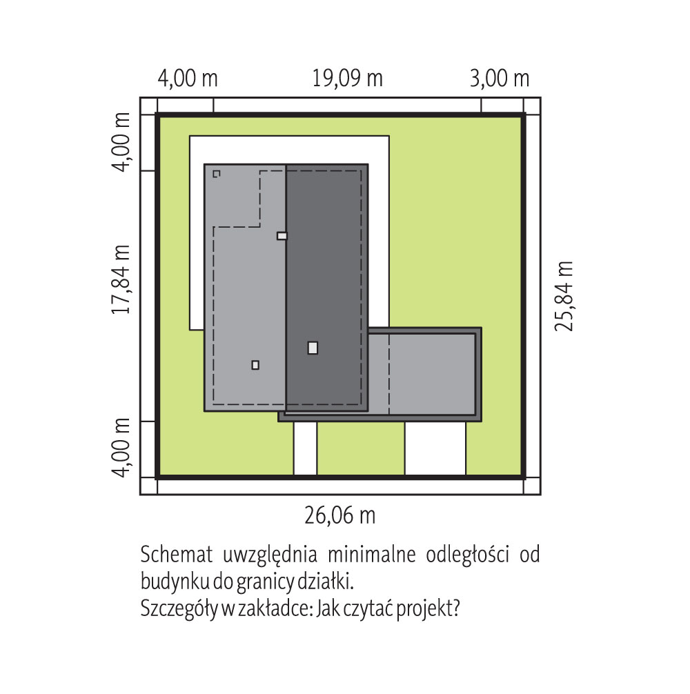 Budynek niepodpiwniczony parterowy bez garażu lub wariantowo z dobudowanym garażem jednostanowiskowym. Możliwość realizacji garażu w późniejszym etapie. Obok wydzielonego pokoju dziennego z osobną kuchnią i narożnikiem z jadalnią, w domu tym znalazły się także 3 sypialnie i 1 łazienka. Przy wejściu zlokalizowane jest pomieszczenie gospodarcze oraz wc. Dom można zrealizować jako bliźniak (styk segmentów garażami). Przyjęty ekonomiczny układ konstrukcyjny nie wymaga ścian nośnych w środku budynku. Dokumentacja dostępna również w odbiciu lustrzanym oraz w wersji z garażem jednostanowiskowym.