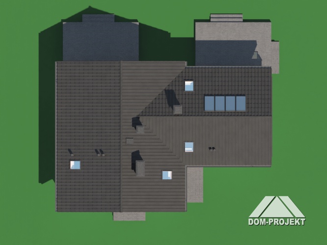 Sień wejściowa prowadzi do dużego holu, który łączy pokój dzienny z pokojem, łazienką i kuchnią. Kilkoma schodami prowadzącymi w dół można dostać się do kotłowni, natomiast bieg do góry prowadzi na użytkowe poddasze. Zlokalizowano tam 4 pokoje sypialne, łazienkę oraz schowek. Garaż dostępny jest z wnętrza budynku poprzez sień wejściową. Rozbudowaną bryłę budynku tworzą dwa zestawione ze sobą prostopadłościany nakryte przenikającymi się dachami dwuspadowymi o kącie nachylenia połaci 45°. Bryłę budynku urozmaicają - obniżony daszek wejściowy oraz podcień tarasu i balkon.