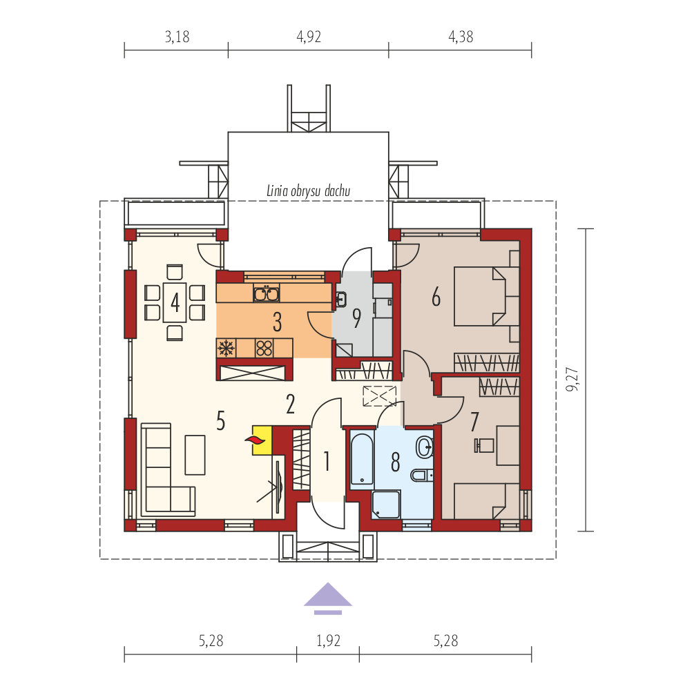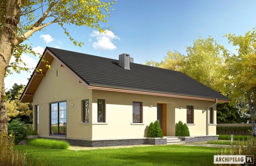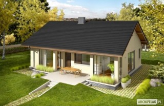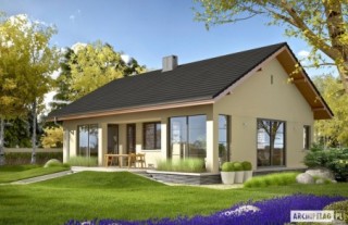 Charakterystyka: dom parterowy, niepodpiwniczonyPrzeznaczenie: dom dla 2-3-osobowej rodzinyTechnologia i konstrukcja:Fundamenty: ławy, bloczki betonowe 24 cm, ocieplenie styropian 15 cmŚciany zewnętrzne: murowane, dwuwarstwowe, beton komórkowy 24 cm, ocieplenie 20 cmStrop: gęstożebrowy Teriva, ocieplenie wełna mineralna 30 cmDach: konstrukcja drewniana, dachówka ceramiczna płaska Bergamo firmy Röben w kolorze antracytowym, więźba dachowa dostępna również w systemie prefabrykacji drewnianejRozwiązania instalacyjne:Ogrzewanie: kocioł gazowy kondensacyjny, rozprowadzenie ciepła: grzejnikiWentylacja: grawitacyjna Wykończenie:Elewacje: tynk cienkowarstwowy mineralny w kolorze TO-PA003 z palety firmy Termo Organika, opaska z płytki klinkierowej Typu AARHUS lun CALAIS firmy RöbenStolarka: drewniana, PVC lub aluminiowa, drzwi wejściowe firmy HörmannWersje - zapytaj o dostępność:- Karmela - taki sam układ funkcjonalny, z wykuszem w strefie dziennej, inne wykończenie elewacji- Karmela II- podobny układ funkcjonalny, z toaletą w strefie dziennej, inne wykończenie elewacji- Odbicie lustrzane do każdej wersjiIstnieje techniczna możliwość:- podpiwniczenia budynku- zbliźniaczenia lub wykonania domu dwulokalowego- wykonania budynku w technologii szkieletowej Atuty projektu okiem architekta:- Subtelna kompozycja elewacji w ciepłym kolorze beżu i szarości- Zwarta bryła budynku sprzyjająca energooszczędności- Funkcjonalne i ergonomiczne wnętrze z podziałem na strefę dzienną i nocną- Salon z dużymi przeszkleniami oraz kominkiem- Funkcjonalne szafy wnękowe- Zacieniony taras w podcieniu- Wygodne zadaszenie nad wejściem do budynku jako osłona przed wiatrem i śniegiem