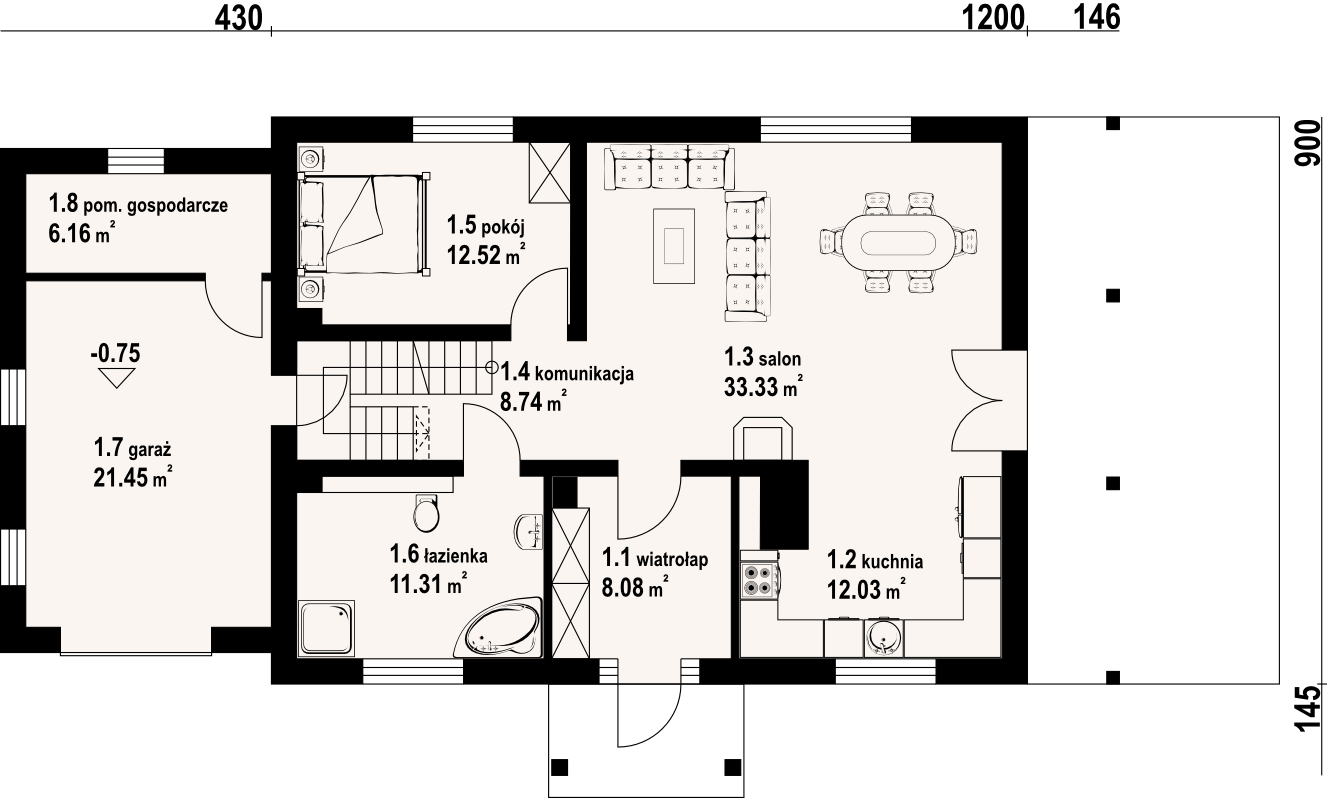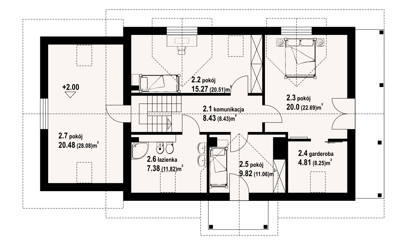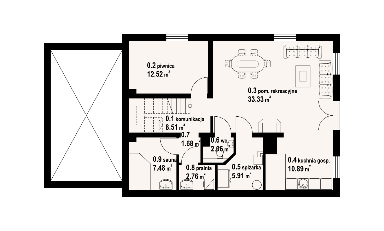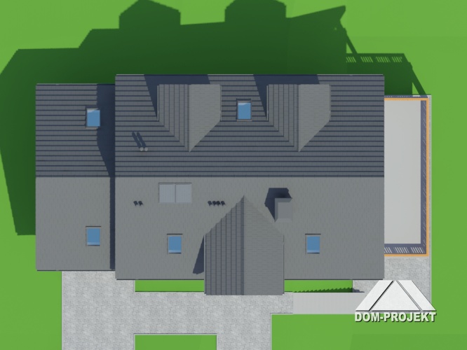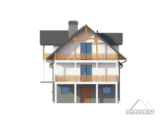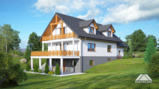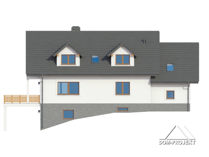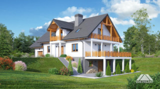 Dom podpiwniczony. Na parterze duży salon z aneksem kuchennym, kominkiem i wyjściem na zadaszony taras. Pokój, łazienka, wiatrołap, komunikacja.Garaż, pomieszczenie gospodarcze. Na poddaszu cztery pokoje, garderoba, dwa balkony i komunikacja. W piwnicach pomieszczenie rekreacyjne z kuchnią gospodarczą, wc, spiżarka, pralnia, sauna, piwnica i komunikacja.