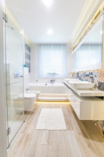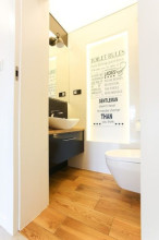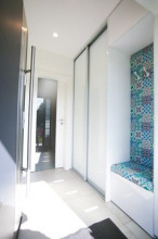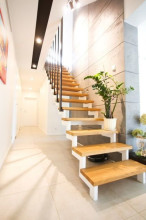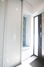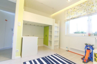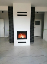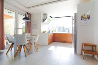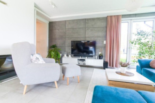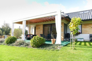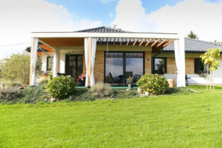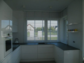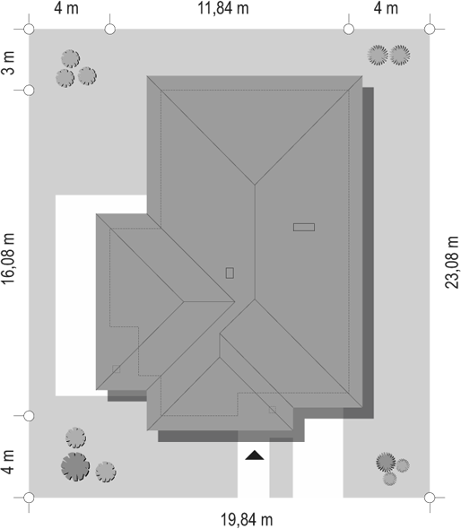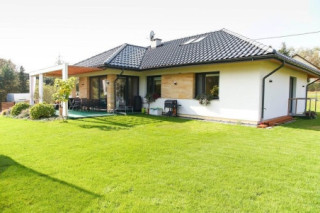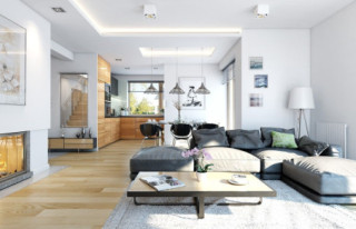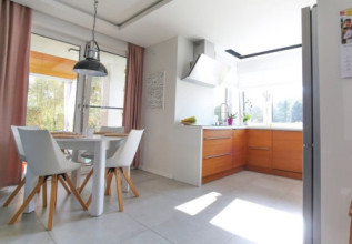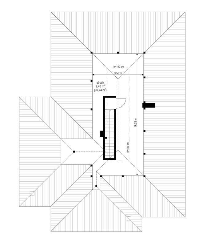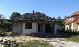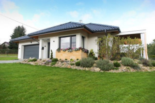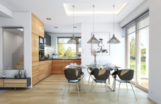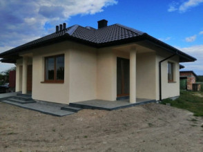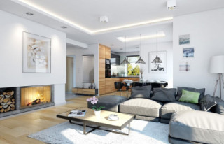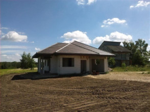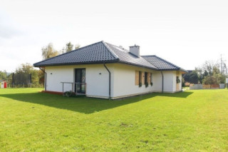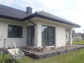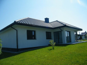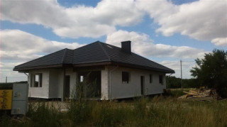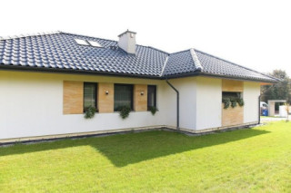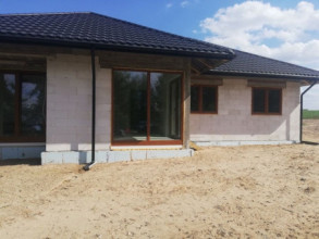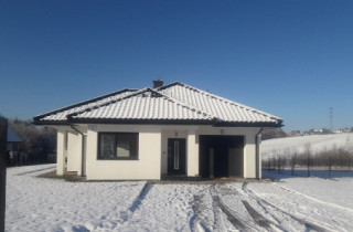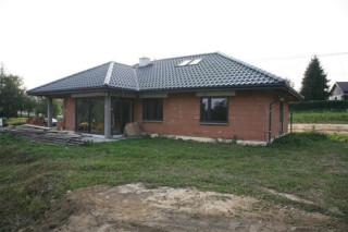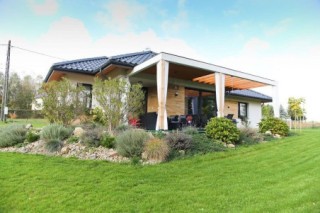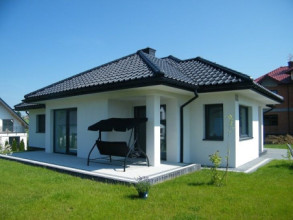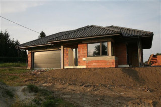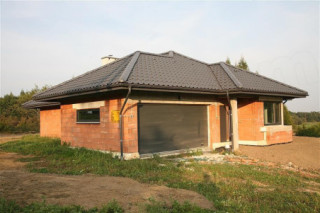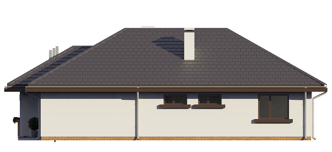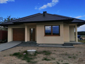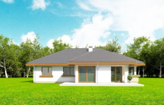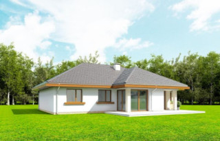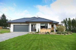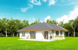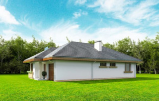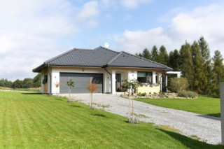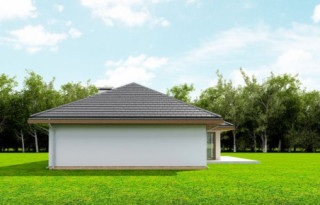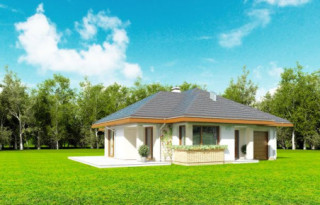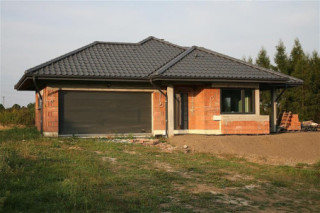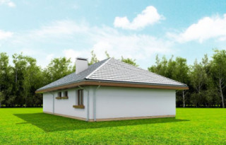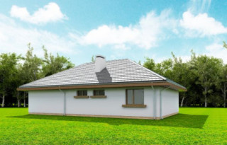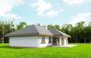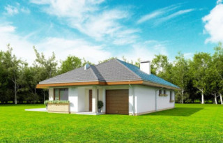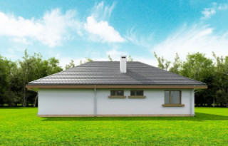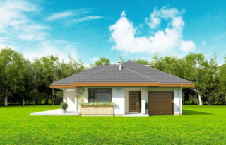Projekt domu Dom na Miarę jest to parterowy dom jednorodzinny dla rodziny 4- 5-osobowej. Nieduży, mieszczący się powierzchnią w wymaganiach programu MDM. Budynek oparty jest na prostokątnym rzucie z wystającą częścią salonu i kuchni. Całość przykryta jest wielospadowym dachem. Dom nadaje się na wąską parcelę, a w szczególności na działkę z wjazdem od południa. Dzięki skierowaniu okien części dziennej i sypialni na elewację boczną i częściowo na front domu, nawet na działce o niekorzystnym układzie względem stron świata, wnętrze będzie dobrze oświetlone. Wygląd zewnętrzny domu współtworzą nowoczesne materiały i rozwiązania, ciekawie rozmieszczone okna, podcienie, narożne okna, okładziny ścian, oraz urozmaicony dach. Całość dopełnia funkcjonalne wnętrze domu. Jednoprzestrzenne wnętrze dzienne, z salonem z częścią wypoczynkową i jadalną, otwartą kuchnią i holem, otwiera się przez duże przeszklenia na narożny, okalający dom taras. W głębi domu znajdują się pokoje domowników - trzy sypialnie, łazienka, oddziel e wc. Z przedsionka przechodzimy do garażu i kotłowni. Schodki z holu prowadzą nas na strych, który można zaadaptować na poddasze. W salonie znajdujemy miejsce na osobne ściany: kominkową i telewizyjną, bajeczne otwarcie na ogród przez narożne okno, oraz wyjście na zadaszony taras. Dom ma nieskomplikowaną konstrukcję i zwartą bryłę. Powinien być niedrogi z budowie i późniejszym utrzymaniu. „Dom na Miarę” jest energooszczędny - ma bardzo dobre ocieplenia przegród. Zapraszamy !