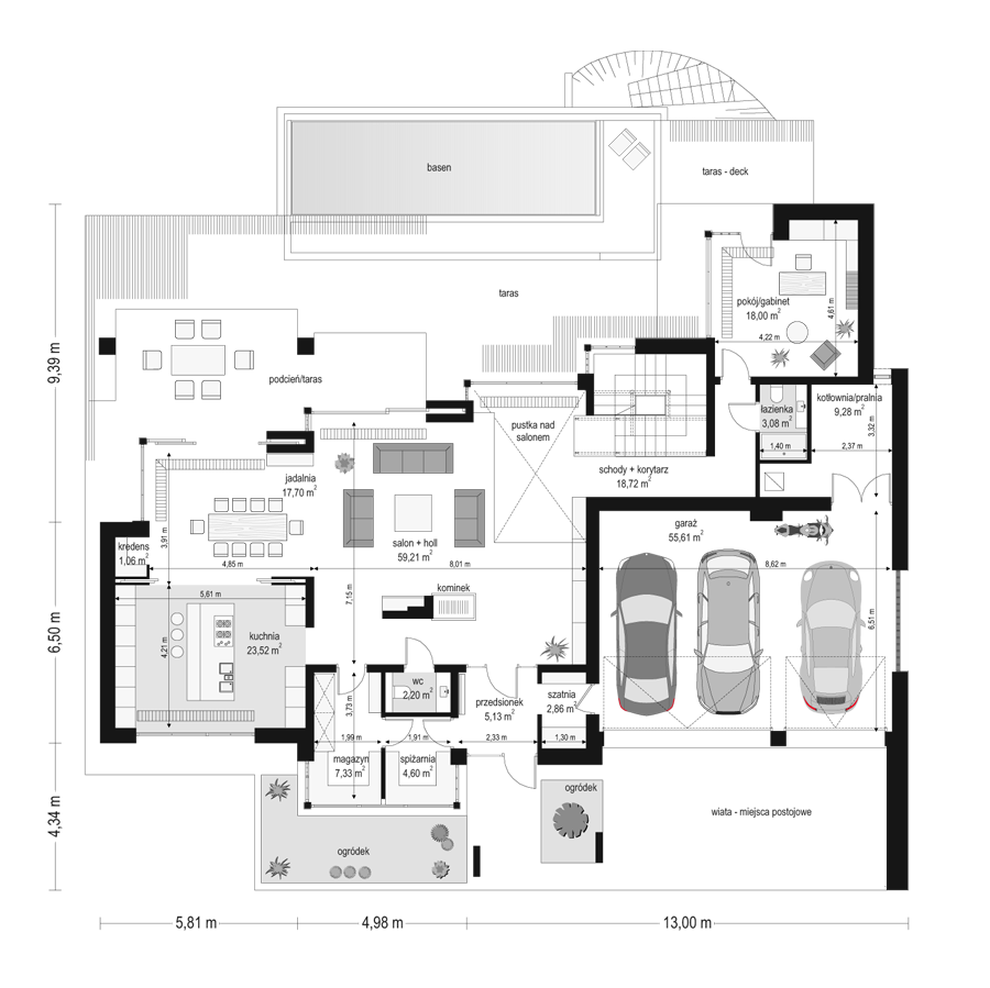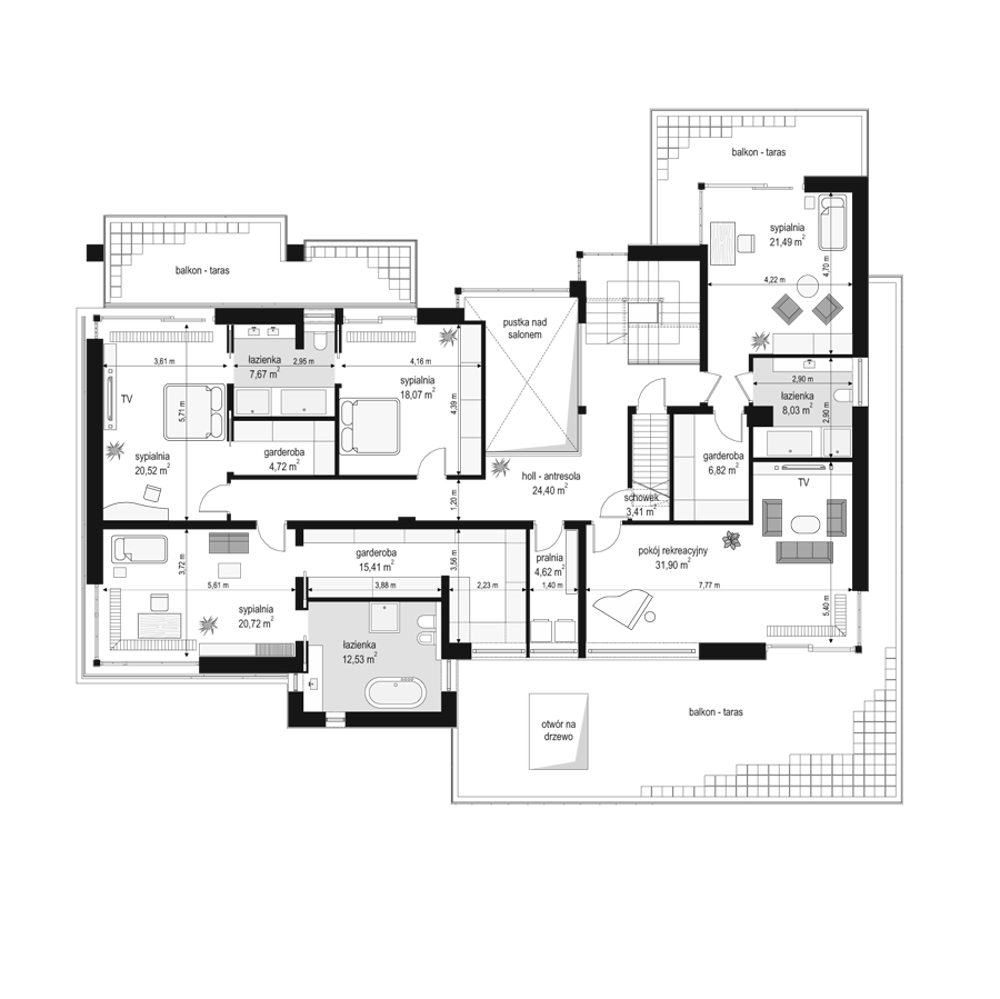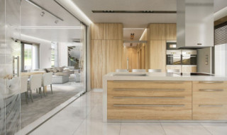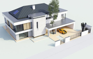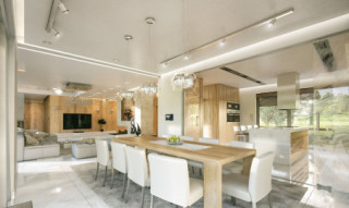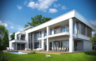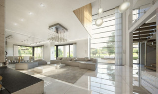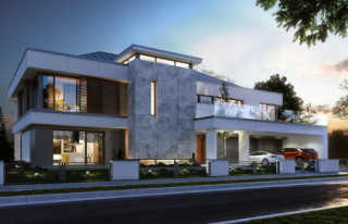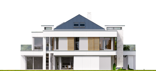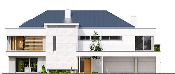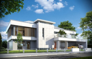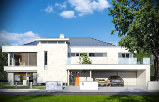 Projekt domu Willa Floryda to luksusowa rezydencja dla 4-7 osobowej rodziny. Bardzo komfortowa, wygodna piętrowa Willa Floryda przeznaczona jest na podmiejską ładną działkę. Architektura Willi Florydy łączy w sobie nowoczesną formę i funkcjonalność rozwiązań. Zarówno okazały wygląd zewnętrzny, jak i obszerne reprezentacyjne wnętrze mają za zadanie podkreślać status i dobry gust właścicieli. Bryła budynku Willa Floryda Front domu Willa Floryda został ozdobiony kamienną dwukondygnacyjną ścianą. Wejście szerokimi drzwiami wiedzie przez zadaszony podest wprost do przeszklonego przedsionka, holu i salonu z pięknym wysokim oknem z widokiem na ogród. Osoba wchodząca do domu ma to wielkie okno i wysoki salon przed sobą. W elewacji frontowej sprytnie ukryto drzwi do wielkiego garażu pod dachem zadaszonych miejsc parkingowych. Strona ogrodowa domu Willa Floryda to duże przeszklenia, elewacja podzielona na poziome pasy, oraz wiszące balkony i tarasy - wszystko otwierające wnętrze domu na otaczający ogród. Willa Floryda wnętrze We wnętrzu domy Willa Floryda zaprojektowano na parterze piękną reprezentacyjną przestrzeń dzienną, z połączonych pomieszczeń holu, salonu, jadalni, pięknej klatki schodowej, oraz dużej kuchni. W projekcie Willa Floryda na parterze znajdują się dodatkowe pomieszczenia gospodarcze, techniczne, oraz potrójny garaż i gabinet. Piętro willi to cztery piękne sypialnie z własnymi garderobami i łazienkami, oraz antresola łącząca piętro z salonem na parterze i pokój rekreacyjny z tarasem. Dom Willa Floryda został zaprojektowany funkcjonalnie i z dużym poszanowaniem przestrzeni. Założeniem było uzyskanie maksymalnie dobrego efektu na nie zbyt dużej powierzchni, żeby nie stracić ludzkiej skali. Projekt Willa Floryda z pewnością jest propozycją dla majętnych inwestorów, nie szukających jednocześnie taniej, krzykliwej elegancji. Pracownia MGProjekt dysponuje kilkoma wersjami projektu Willa Floryda, ich odbiciami lustrzanymi, oraz wariantami. Według kosztorysantów MGProjekt koszt budowy domu Willa Floryda do stanu surowego zamkniętego to 574448 zł. Zapraszamy do zapoznania się z pełną ofertą pracowni MG Projekt: projekt domu Willa Floryda 2, projekt domu Willa Floryda 3, projekt domu Willa Floryda 4, projekt domu Willa Floryda 5, projekt domu Willa Floryda 6, projekt domu Willa Floryda 7, projekt domu Willa Floryda 8, projekt domu Rezydencja Floryda, projekt domu Rezydencja Floryda 2.