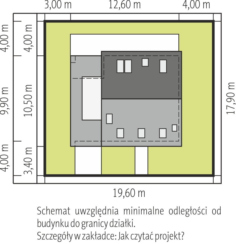 Projekt domu Kastalia wymaga obszernej działki. Jest jedną z niewielu propozycji dużego domu parterowego bez garażu, dla którego należy przewidzieć dodatkowe miejsce. Rozbudowany w kształcie litery L rzut tworzy charakterystyczny wewnętrzny dziedziniec z wejściem frontowym. Szczególnie atrakcyjna, ze względu na imponującą wielkość, jest jednoprzestrzenna część dzienna z wydzielonym gabinetem. Zajmuje ona niemal w całości jedno z dwóch identycznych skrzydeł budynku. Duża kuchnia z jadalnią i przestronny salon otwierają się na ogród i atrium trojgiem podwójnych drzwi balkonowych. Strefa prywatna z zespołem łazienek i kotłowni z pralnią zajmuje drugie skrzydło. Narożnik wypełnia główna sypialnia z własną łazienką. Konstrukcja, nachylenie, rozpiętość i kształt czterospadowych przenikających się nad planem Kastalii dachów nie zakłada użytkowego charakteru poddasza. Projekt domu Kastalia jest typowo parterową koncepcją o horyzontalnych proporcjach i złożonej, łatwo wpisującej się w otoczenie sylwetce.