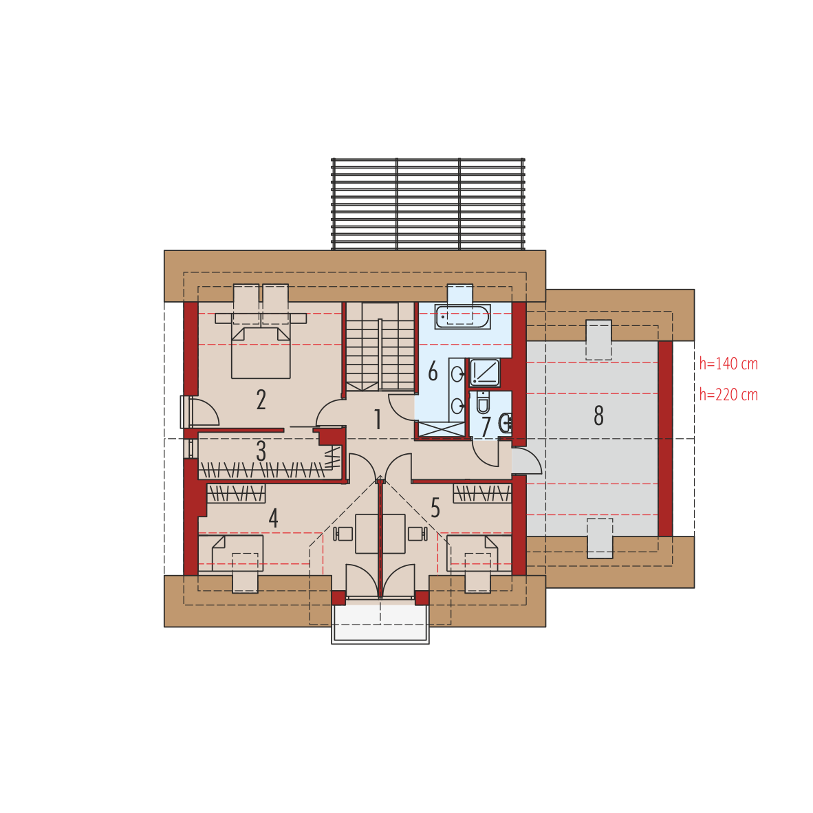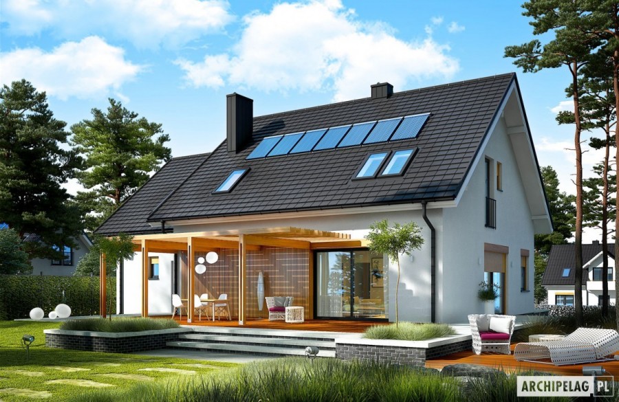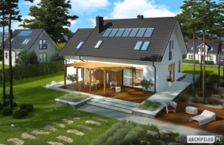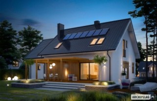Charakterystyka: Dom parterowy z poddaszem użytkowym, niepodpiwniczony, z garażem jednostanowiskowymPrzeznaczenie: Dom dla 3-5-osobowej rodzinyTechnologia i konstrukcja:Ściany zewnętrzne: murowane, dwuwarstwowe, beton komórkowy firmy Solbet 24 cm, ocieplenie styropian Termo Organika 20 cmŚciany wewnętrzne: nośne i działowe murowane,beton komórkowy firmy Solbet, 24 cm i 12 cmStrop: międzypiętrowy gęstożebrowy TerivaDach: konstrukcja drewniana, ocieplenie wełna mineralna 30 cm, dachówka ceramiczna płaska Bergamo firmy RöbenInne: schody wewnętrzne drewniane Rozwiązania instalacyjne:Ogrzewanie: kocioł gazowy kondensacyjny, rozprowadzenie ciepła: grzejnikiWentylacja: grawitacyjna Wykończenie:Elewacje: tynk cienkowarstwowy mineralny w kolorze TO-PA001 z palety firmy Termo Organika, okładzina drewnianaStolarka: drewniana, PVC lub aluminiowa, rolety zewnętrzne w systemie CleverBox firmy BeClever, drzwi wejściowe i brama garażowa firmy HörmannOkna połaciowe: rozwiązania technologiczne i wyłaz dachowy firmy FAKROOtoczenie: płyty tarasowe firmy Libet, system tarasowy ProDeck - deska kompozytowa Terra w kolorze orzech Wersje - zapytaj o dostępność:- Katrina (mała) - bez garażu i z garażem dwustanowiskowym- Katrina - większa powierzchnia użytkowa, różne wersje garaży- Katrina II ENERGO PLUS - inne wykończenie elewacji, instalacje energooszczędne: pompa ciepła, wentylacja mechaniczna z odzyskiem ciepła, różne wersje garaży- Katrina III ENERGO PLUS - inne wykończenie elewacji, instalacje energooszczędne: pompa ciepła i wentylacja mechaniczna z odzyskiem ciepła, różne wersje garaży- odbicie lustrzane Istnieje techniczna możliwość:- podpiwniczenia budynku- wykonania zabudowy bliźniaczej- wykonania budynku w technologii szkieletowej