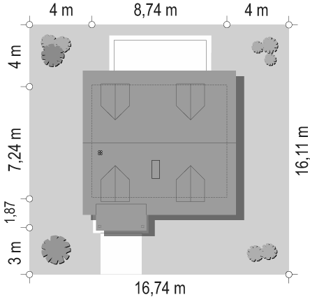 Jednorodzinny budynek mieszkalny, parterowy, niepodpiwniczony. Optymalny układ pomieszczeń zapewnia komfort 4-osobowej rodzinie. W części dziennej domu zaprojektowano kuchnię ze spiżarnią oraz salon z jadalnią otwierający się na zewnątrz poprzez szereg przeszkleń. Część nocna to trzy sypialnie oraz łazienka. W części gospodarczej przewidziano kotłownię oraz dwustanowiskowy garaż. Ściany: 2-warstwowe - pustak ceramiczny + styropian, Stropy: z wiązarów dachowych firmy MITEK, Dach: dachówka, kąt nachylenia 25°