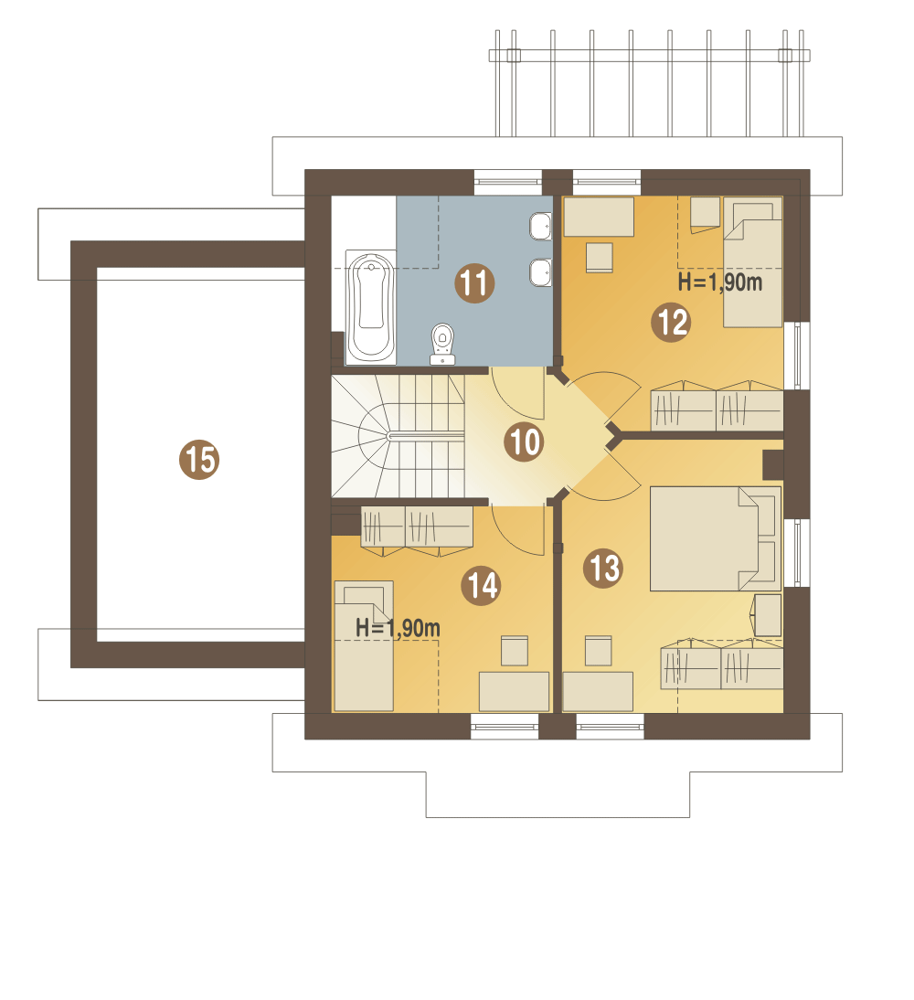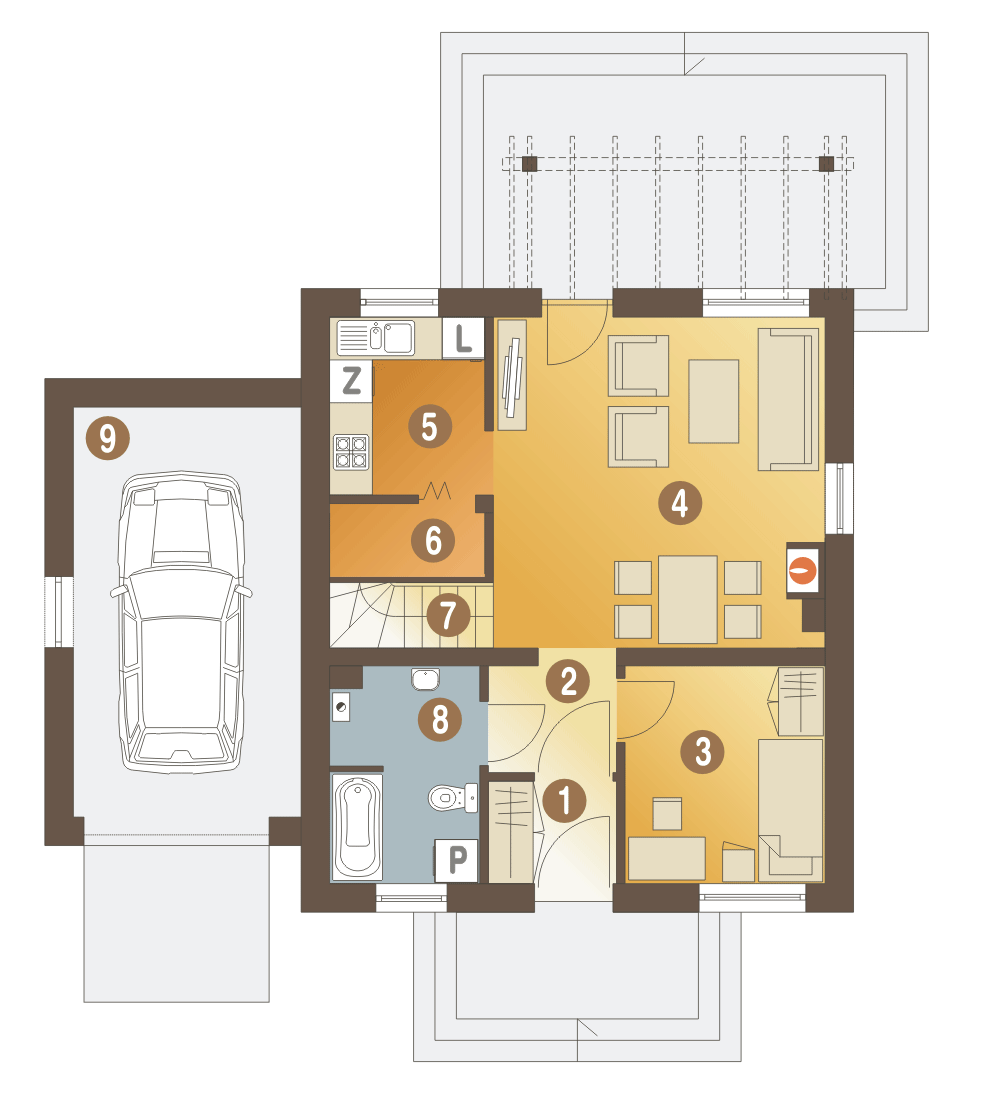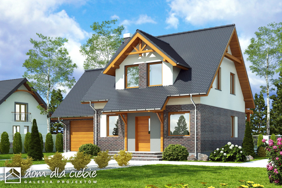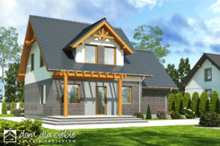 Niewielki dom jednorodzinny przeznaczony dla 4-osobowej rodziny, nadający się na wąską działkę. Nad wejściem funkcjonalny daszek chroniący przed opadami, a na tarasie pergola zacieniająca. Na parterze przewidziano salon, kuchnię ze spiżarnią i pomieszczenie gospodarcze oraz dodatkowy pokój/gabinet. Na poddaszu trzy sypialnie oraz wygodną łazienkę. ...Sprawdź inne projekty domów. Zapraszamy!