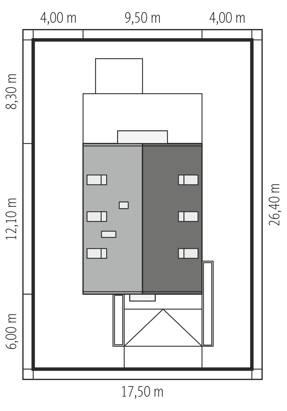 Jest to dom parterowy z nieużytkowym poddaszem, niepodpiwniczony, z jednostanowiskowym garażem usadowionym częściowo w bryle obiektu. Zamyka go dwuspadowy dach o kącie nachylenia 30 stopni.