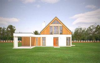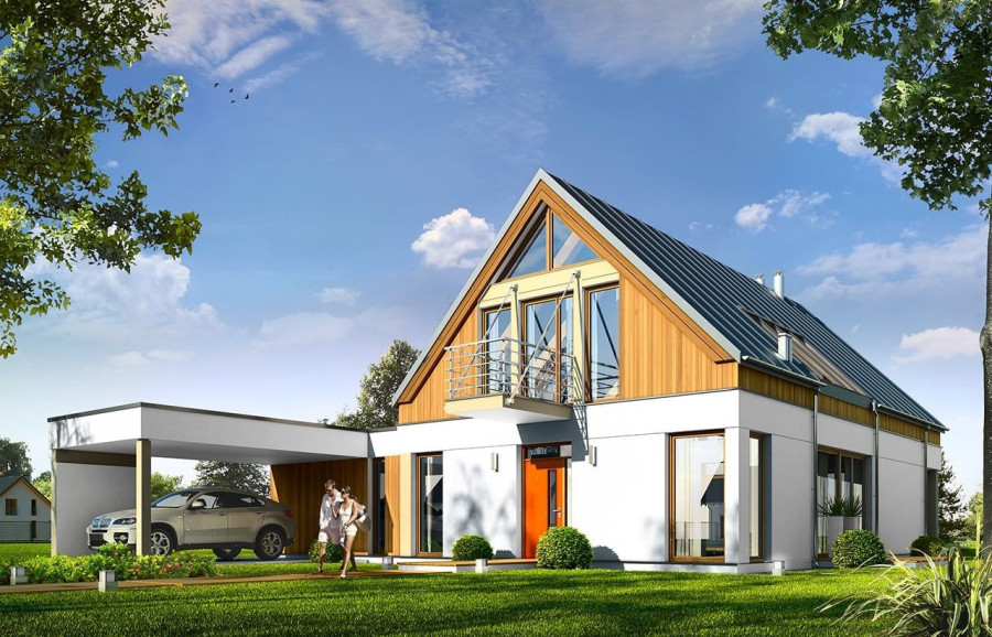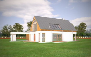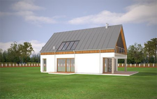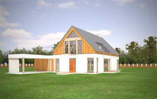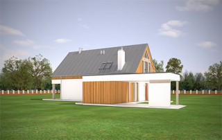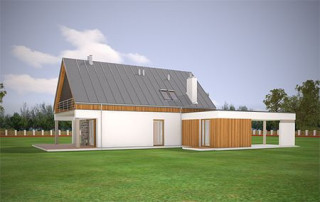 Projekt domu Domino to wyjątkowy dom jednorodzinny, o ciekawej, nietuzinkowej architekturze. Zarówno jego forma architektoniczna, układ brył, detale wykończeniowe i zastosowane materiały - czynią z niego budynek oryginalny i niepowtarzalny. Nowoczesna stylistyka idzie tutaj w parze z funkcjonalnością, oraz z energooszczędnością budynku. Głównym założeniem projektu było uzyskanie prostej bryły przykrytej dwuspadowym dachem z minimalnymi okapami i zaplanowanie wnętrz domu na osi wzdłuż kalenicy - od wejścia, do ściany ogrodowej salonu, z dużymi przeszkleniami i centralnie umieszczonym kominkiem. Frontowy „balkon-mostek”, będący jednocześnie zadaszeniem nad wejściem, oraz wyciągnięty dach nad tarasem od strony ogrodu, powiększają efekt wizualny wydłużenia budynku. Uzupełnienie i przełamanie kompozycji stanowi dobudowana z boku parterowa bryła z płaskim dachem, kryjąca wiatę garażową i dodatkowy pokój. Wnętrze domu zaplanowano w taki sposób, aby maksymalnie uatrakcyjnić przestrzeń dzienną. Mamy tutaj: jednobiegowe nowoczesne schody połączone z pustką nad jadalnią, jadalnię z pięknym przeszkleniami i świetlikiem w dachu, salon z dużymi przeszkleniami na zadaszony taras i ogród, oraz centralnie ustawionym kominkiem, holl i częściowo otwartą kuchnię. Na parterze mamy aż dwa dodatkowe pokoje, łazienkę i kotłownię. Na poddaszu z kolei przewidziano trzy sypialnie, łazienkę i garderobę rodziców. Zarówno wnętrze jak i wygląd zewnętrzny domu zaprojektowano z myślą o Inwestorach lubiących ciekawe, nietuzinkowe rozwiązania i nowoczesną architekturę. Dom jest przy tym łatwy w budowie, ma prostą konstrukcję. Projekt domu Domino dzięki swojej prostocie i zwartości, oraz świetnym izolacjom jest też energooszczędny i będzie niedrogi w utrzymaniu (można go łatwo dostosować do standardu NF40). Zapraszamy !