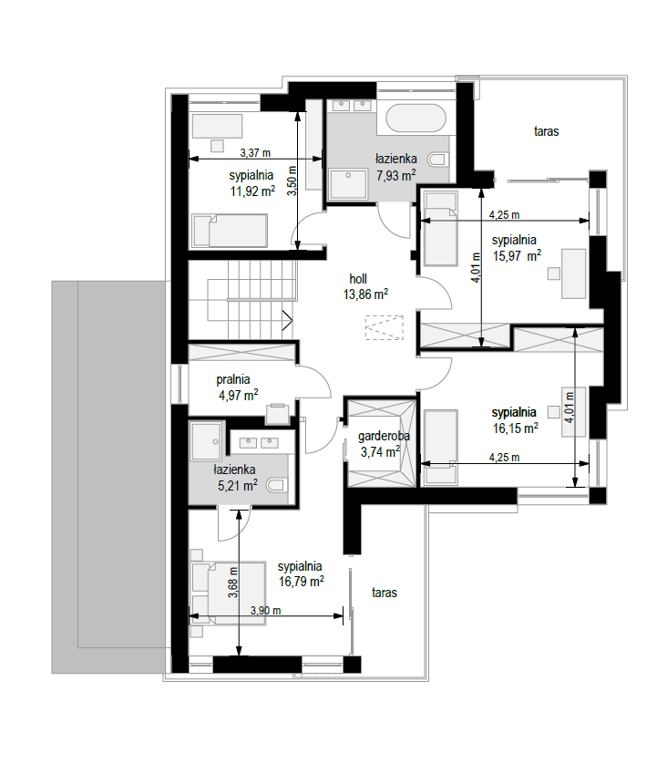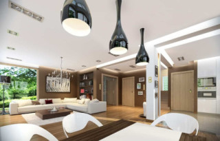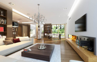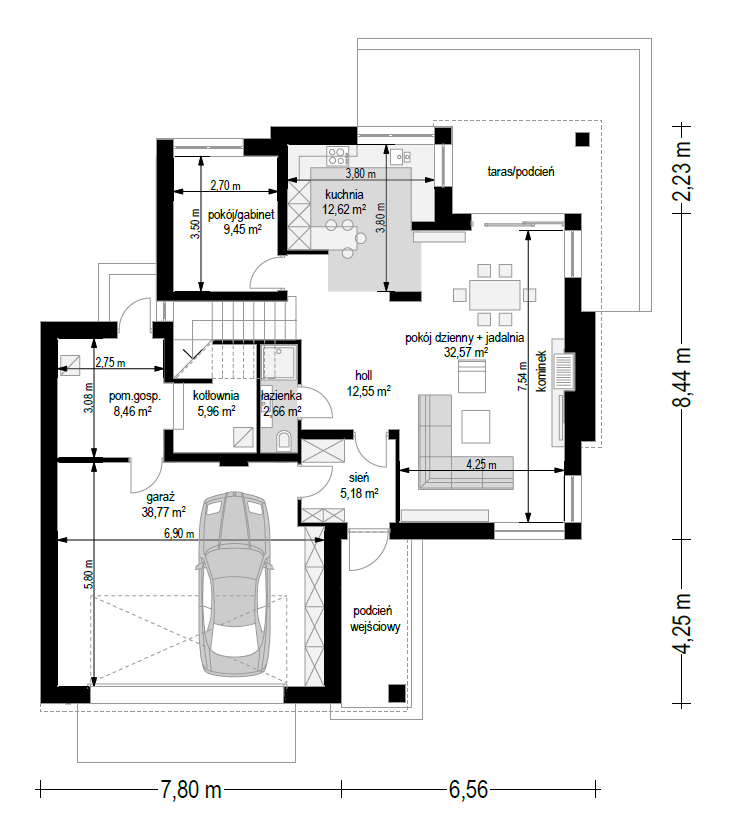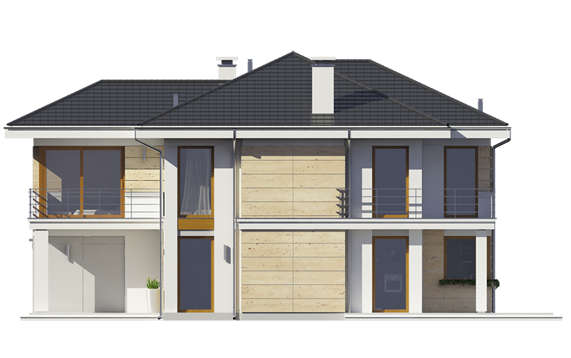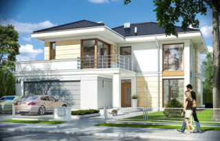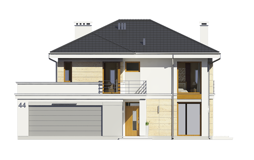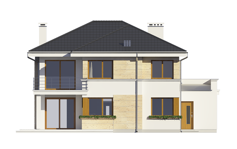 Koniczynka to uroczy domek jednorodzinny dla cztero-pięcioosobowej rodziny - parterowy z poddaszem użytkowym, z wbudowanym garażem. Jego prosta bryła i nieskomplikowana konstrukcja zapewni łatwą i niedrogą budowę. Jednocześnie niewielka powierzchnia domu, połączona z funkcjonalnością i sensownym układem pomieszczeń, da oszczędności w późniejszym utrzymaniu budynku. Prostokątny rzut domu przekrywa dwuspadowy dach, ozdobiony od przodu i od ogrodu szerokimi lukarnami. Wygląd zewnętrzny łączy w sobie tradycyjną, solidną formę, oraz nowoczesne materiały i detale architektoniczne. Lekka, prosta bryła, o symetrycznych elewacjach ma w sobie jednocześnie dużo wdzięku i elegancji. Wnętrze domu zaprojektowano z podziałem na parter – jako część dzienną i gospodarczą z garażem, oraz poddasze – z sy