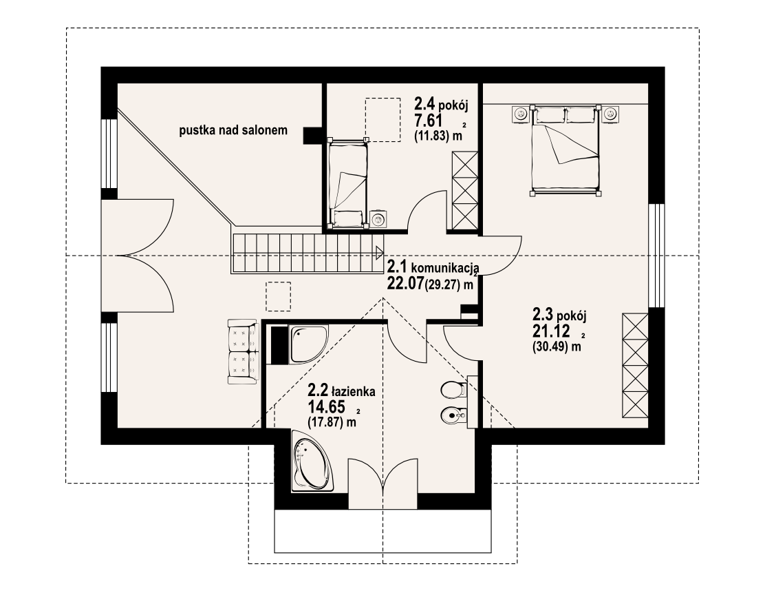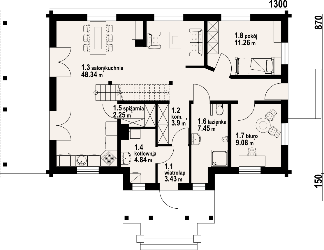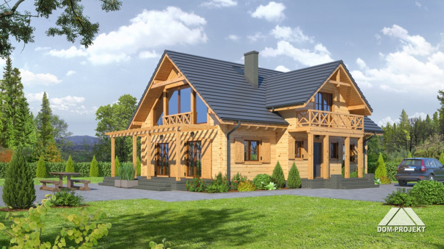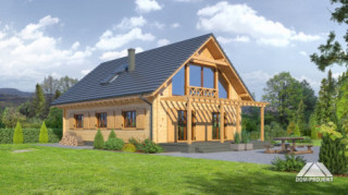 Wygodny dom z bali drewnianych.Atrakcyjna architektura budynku. Duży salon z aneksem kuchennym, kominkiem i wyjściami na duży taras. Nad częścią salonu pustka i antresola. Na parterze ponadto: wiatrołap, kotłownia, spiżarka, łazienka, pokój i pokój biurowy. Na poddaszu dwa pokoje, duża łazienka i antresola.