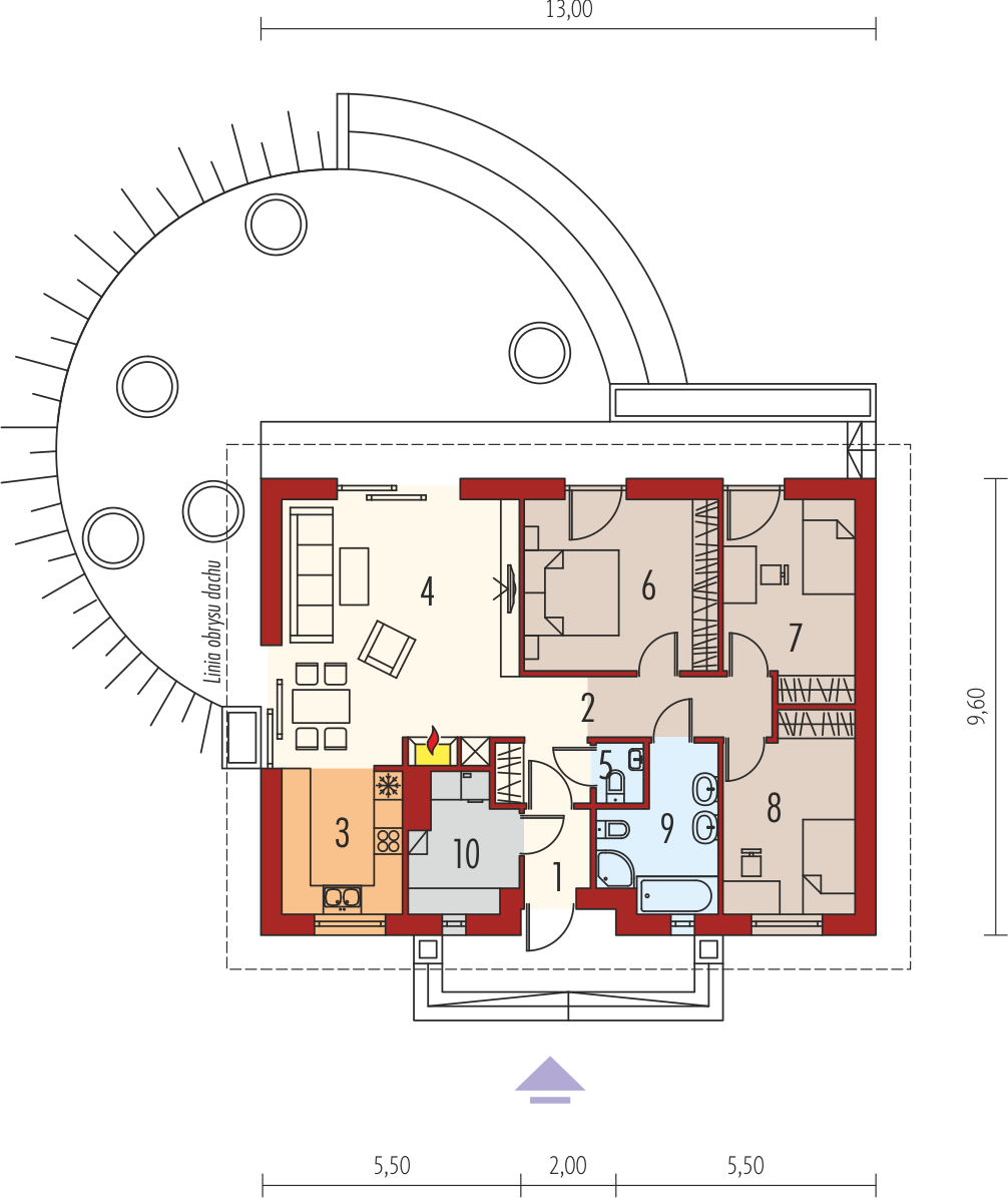 W projekcie zastosowano systemy zabudowy ścian działowych i sufitów podwieszanych Rigips. Więźba dachowa w systemie dachu prefabrykowanego w systemie płytki kolczastej MITEK.Charakterystyka: Dom parterowy, niepodpiwniczony Przeznaczenie: Dom dla 3-4-osobowej rodziny Technologia i konstrukcja: Fundamenty: ławy, bloczki keramzytowe 24 cm, ocieplenie styropian 15 cm Ściany zewnętrzne: murowane, dwuwarstwowe, keramzyt 24 cm, ocieplenie 20 cm Ściany wewnętrzne: ścianki działowe w systemie suchej zabudowy Rigips 12 cm Podłoga na gruncie: płyta betonowa, ocieplenie styropian 15 cm Strop: pas dolny wiązara stanowi konstrukcję, sufit podwieszony Rigips Dach: wiązary drewniane prefabrykowane, ocieplenie wełna mineralna 30 cm, dachówka ceramiczna RöbenRozwiązania instalacyjne:Ogrzewanie: kocioł gazowy kondensacyjny, rozprowadzenie ciepła: grzejnikiWentylacja: grawitacyjna Wykończenie:Elewacja: tynk cienkowarstwowy mineralny i okładzina ceglanaStolarka: drewniana, PCV lub aluminiowa, drzwi wejściowe firmy Hörmann, rolety zewnętrzne w systemie CleverBox firmy BeClever Wersje - zapytaj o dostępność: - Kornel ENERGO– inne wykończenie elewacji - Kornel II ENERGO – inne zaakcentowanie strefy wejściowej, z zadaszeniem tarasu ogrodowego - Kornel III ENERGO – inne zaakcentowanie strefy wejściowej - Kornel IV ENERGO – różne wersje garaży lub wiata - Kornel V ENERGO – inne zaakcentowanie strefy wejściowej - Kornel VI ENERGO – inne zaakcentowanie strefy wejściowej, z zadaszeniem tarasu ogrodowego - każda wersja z wiatą, garażem jedno- lub dwustanowiskowym oraz bez garażu - odbicie lustrzane do każdej wersji Różnice i podobieństwa: - różne propozycje wykończenia elewacji - technologia murowana - taki sam układ funkcjonalny we wszystkich wersjach - różnice w aranżacjach strefy sanitarnej - standard ociepleń ENERGO we wszystkich wersjach Istnieje techniczna możliwość: - zbliźniaczenia lub wykonania domu dwulokalowego - wykonania domu w technologii szkieletowej - podpiwniczenia Atuty projektu okiem architekta: - Zwarta, klasyczna bryła budynku minimalizująca możliwość wystąpienia mostków termicznych i sprzyjająca energooszczędności - Szybkie w montażu prefabrykowane elementy dachu z gwarancją jakości, stanowiące jednocześnie konstrukcję stropu, eliminują konieczność stawiania ścian nośnych, fundamentów i stropu żelbetowego - Ścianki wewnętrzne w technologii lekkiej umożliwiające dowolność w aranżacji wnętrz - Ergonomiczne i kompaktowe pomieszczenia, z wyraźnym podziałem na strefę dzienną oraz nocną - Otwarta przestrzeń strefy dziennej integrująca życie rodzinne - Szybka i ekonomiczna budowa