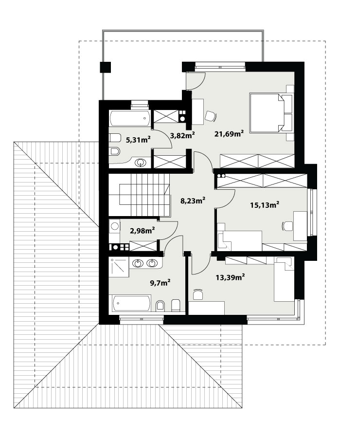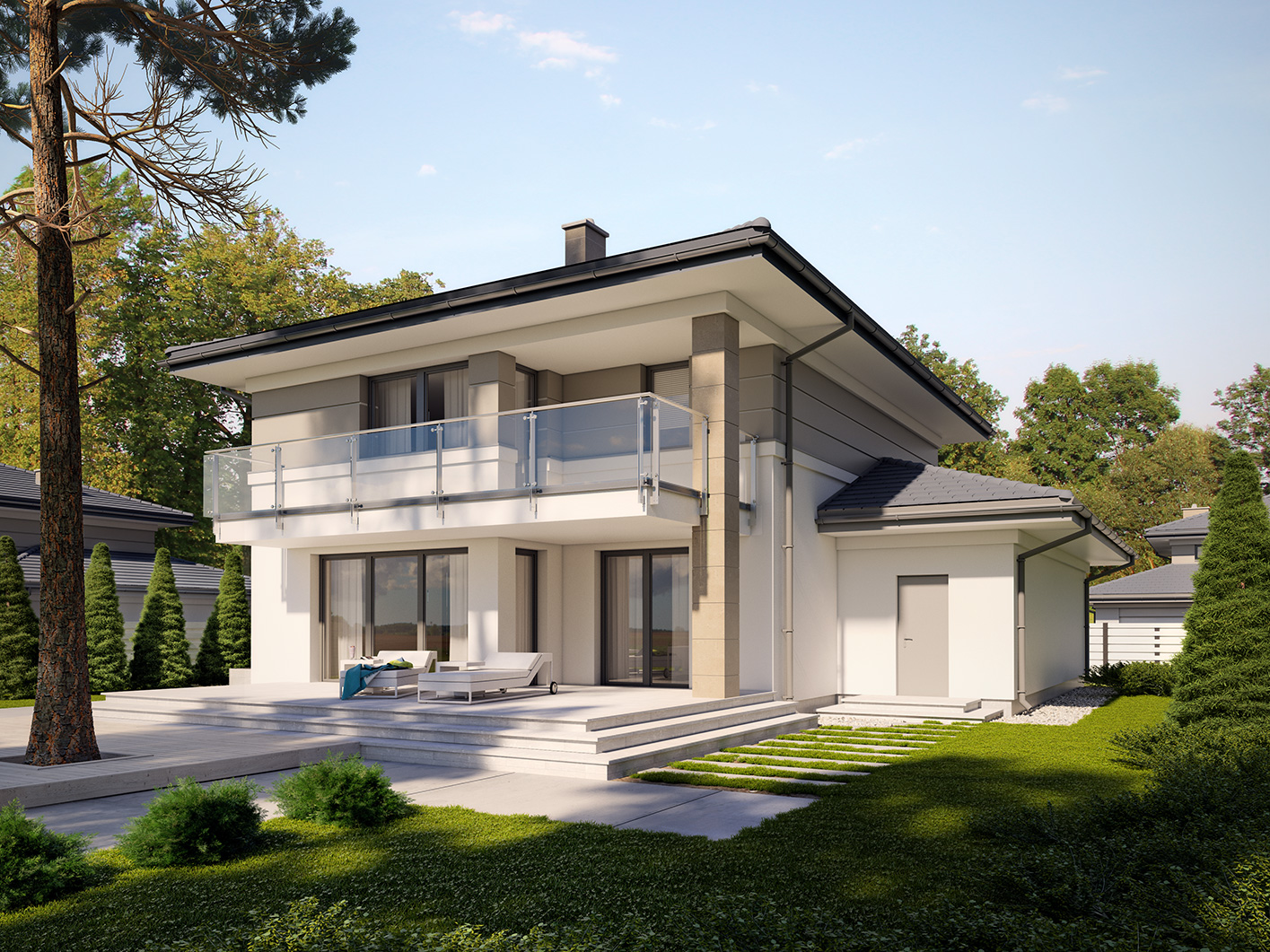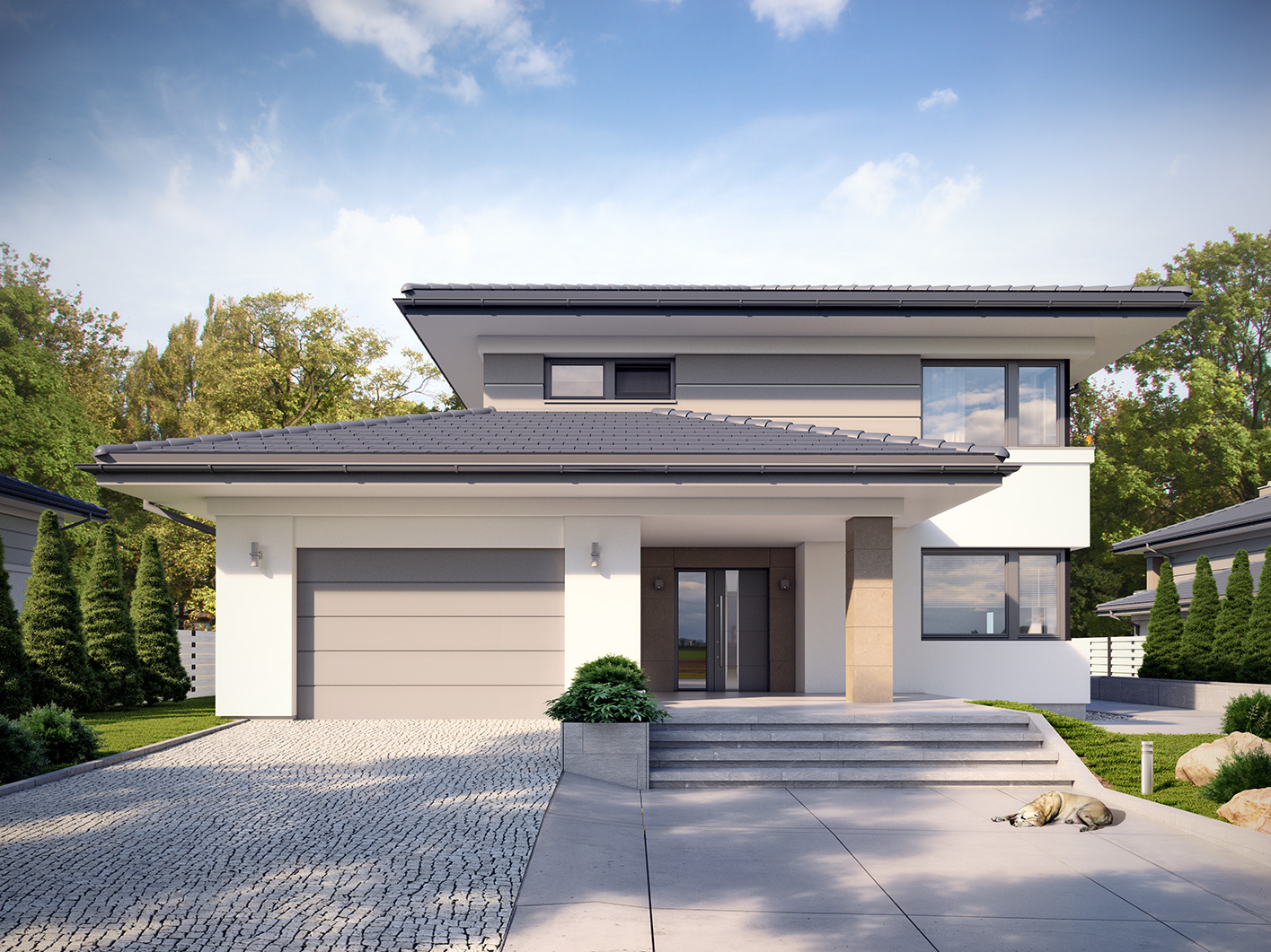 Korso, to projekt reprezentacyjnego domu piętrowego przeznaczonego dla 4-osobowej rodziny. Jest to typowo miejska rezydencja o nowoczesnym wyglądzie i optymalnej powierzchni użytkowej. Posiada bogaty program funkcjonalny, rozłożony na dwóch pełnych kondygnacyjnych, który zapewni komfort nawet dla wymagających inwestorów. Parter zaprojektowano jako otwartą przestrzeń dzienną, złożoną z połączonego salonu, jadalni i kuchni. Przewidziano tutaj także dodatkowy pokój, który można wykorzystać jako gabinet lub dodatkową sypialnię. Na parterze znajduje się również duża kotłownia, na każdy rodzaj paliwa oraz garaż o szerokości 1,5 miejsca postojowego.Dzięki osłonięciu częściowo zadaszonych tarasów, uzyskano na tarasie prywatną strefę wypoczynku. Na piętrze zaprojektowano 3 sypialnie, łazienkę i pralnię. Główna sypialnia ma zapewnioną własną garderobę oraz łazienkę. Taką dodatkową przestrzeń można według potrzeb przerobić np. na kącik do pracy. Korso zachwyca wysmakowaną, ponadczasową, klasyczną bryłą ujętą we współczesny elegancki wizerunek. Rezydencja ta stanowi doskonałą propozycję dla inwestorów poszukujących komfortowego domu w estetycznym wydaniu.