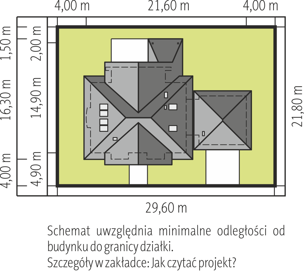 Dom z poddaszem. Duży salon z aneksem kuchennym, kominkiem, schodami na poddasze i wyjściem na taras. Pokój (praca w domu), łazienka, korytarz, wiatrołap, garaż i kotłownia. Na poddaszu cztery pokoje, trzy łazienki, dwa balkony i komunikacja. Zwarta bryła budynku sprzyja szybkiej i taniej budowie i niskim kosztom eksploatacji.