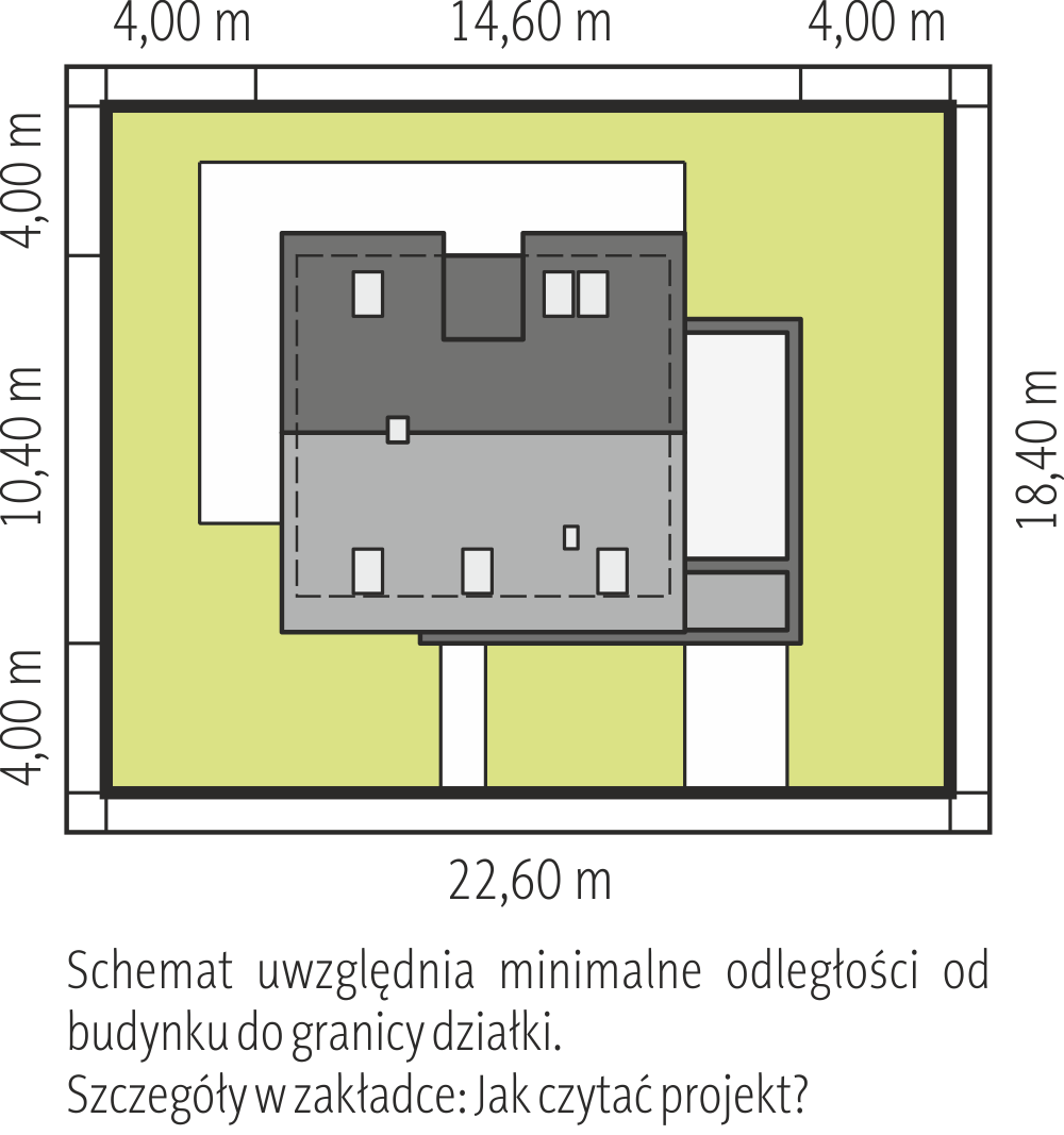 Dom mieszkalny, jednorodzinny, przeznaczony dla 3 – 4-osobowej rodziny. Nowoczesne elementy domu podkreślają jego oryginalność. Istnieje możliwość wybudowania domu bez garażu.Ściany: 2-warstwowe - pustak ceramiczny + styropian, Stropy: żelbetowe, wylewane, Dach: blacha na rąbek stojący Classic Ruukki, kąt nachylenia 40°