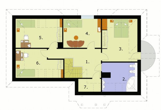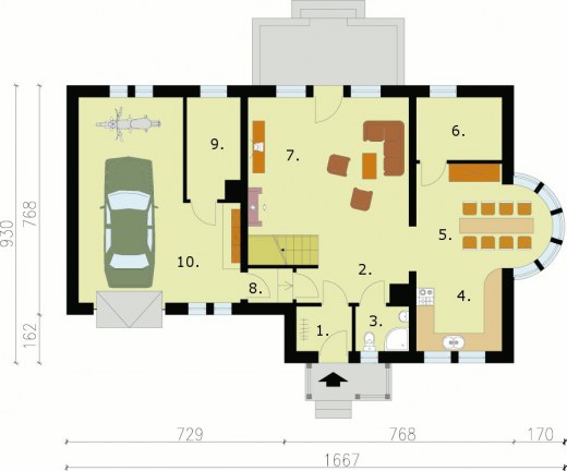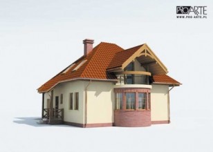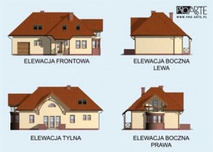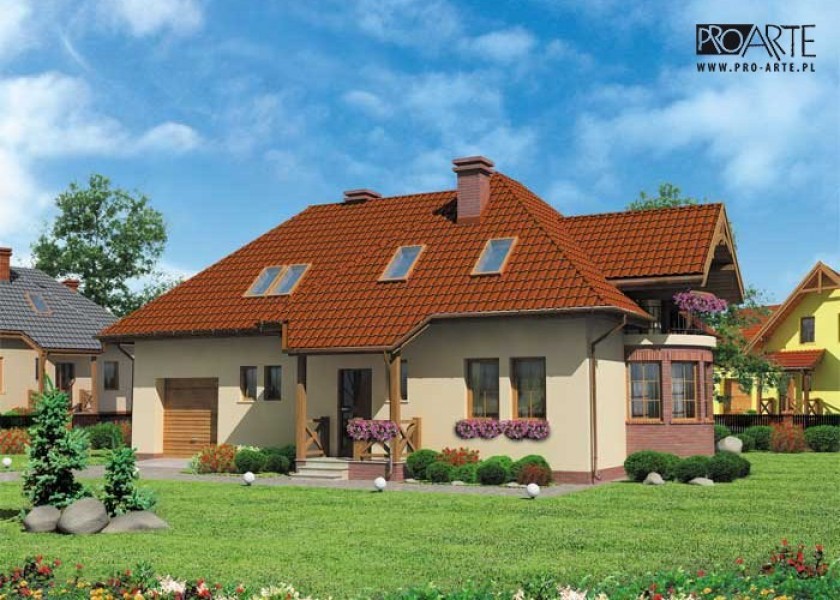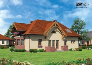 "Lagos" To projekt obszernego domu jednorodzinnego, niepodpiwniczonego, z możliwością adaptacji kotłowni na węgiel. Elewacja frontowa tego obiektu przyciąga wzrok dzięki uroczemu, zadaszonemu wejściu, obok którego umieszczono wjazd do jednostanowiskowego garażu. Wrażenie robi jednak przede wszystkim prawy bok domu, gdzie mamy półokrągły ryzalit. Z tyłu przewidziano wyjście na taras. Wnętrze domu Lagos daje poczucie bezpieczeństwa i komfortu. Wchodzi się tutaj przez wiatrołap. Idąc na lewo, można, przez przedsionek, wejść do garażu, a następnie do kotłowni – takie usytuowanie pomieszczeń będzie sprzyjało utrzymaniu porządku w domu, ponieważ kotłownia została w zdecydowany sposób oddzielona od reszty pomieszczeń. Przeciwną część parteru zajmują natomiast pomieszczenia, z któ