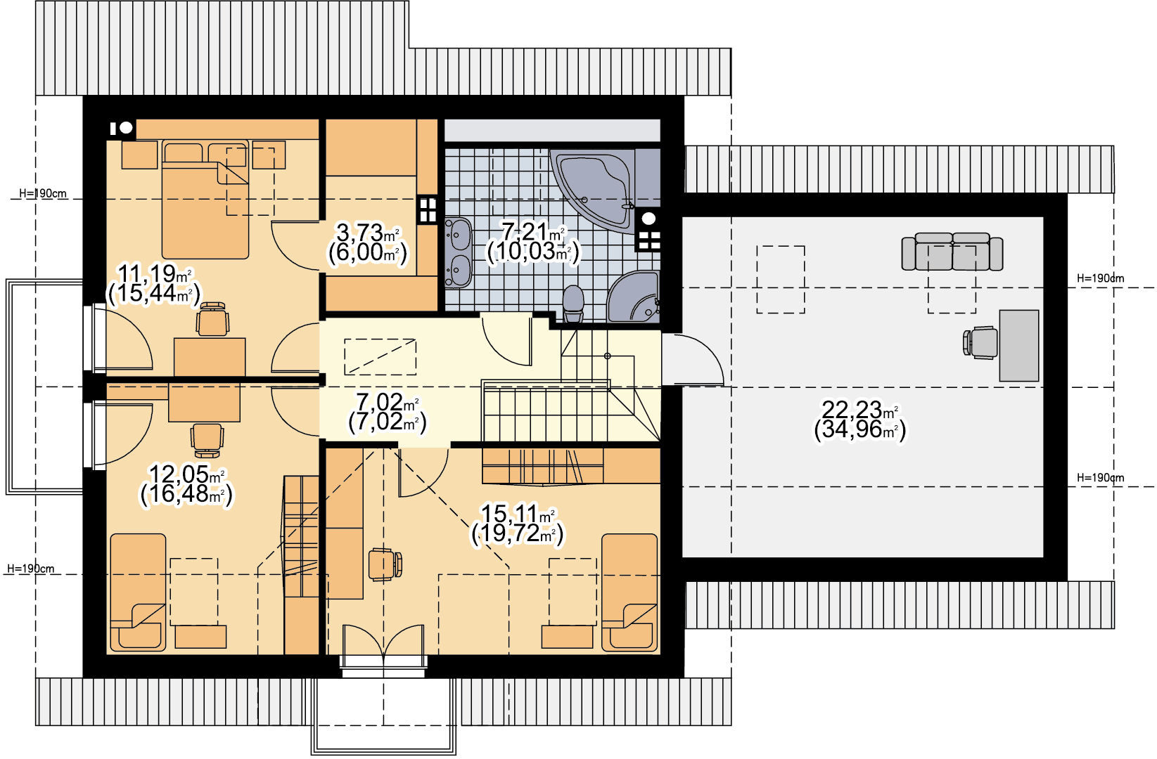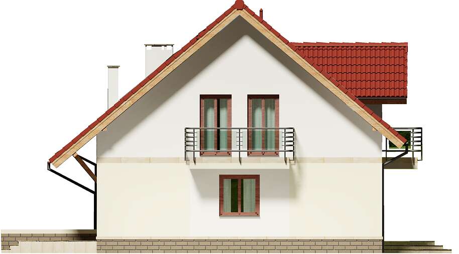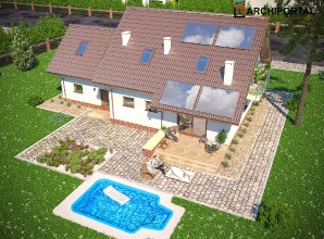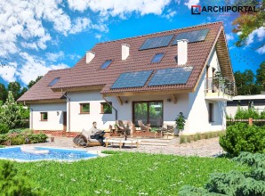 Projekt domu z poddaszem użytkowym, przeznaczony dla 4-5 osobowej rodziny. Do środka dostajemy się przez duży wiatrołap, otwierający się na resztę domu nowoczesnym przeszkleniem wejściowym. Na parterze znajduje się sporych rozmiarów salon z ciekawym wykuszem jadalnym, w którym spożywanie posiłków będzie prawdziwą przyjemnością. Pokój dzienny sąsiaduje bezpośrednio z otwartą kuchnią, którą w razie potrzeby można oddzielić ścianką działową. Zaprojektowano tu sporą spiżarnię, a na środku kuchni zmieści się bez trudu praktyczna wyspa. Do dyspozycji mieszkańców jest ponadto dodatkowy pokój z własną łazienką, który można przeznaczyć na sypialnię rodziców lub pokój seniora. Do garażu dostajemy się przez sporych rozmiarów kotłownię, w której bez trudu zmieścił się piec na paliwo stałe. Jednostanowiskowy garaż jest na tyle duży, że pomieści narzędzia ogrodowe lub dodatkowy opał. Poddasze to typowa strefa nocna, jest tu łazienka z miejscem na wannę i prysznic oraz aż 4 sypialnie. Jeden z pokojów, w razie potrzeby, można przeznaczyć na gabinet lub garderobę. Prawdziwą zaletą jest natomiast pomieszczenie nad garażem dostępne ze spocznika schodów, przykryto je dachem dwuspadowym, żeby powierzchnia użytkowa była jak największa. W ten sposób uzyskano dodatkowy pokój, który może pełnić rolę strychu, pralni, pokoju hobby lub kolejnej sypialni. Elewacja domu ma charakter nowoczesny z okładziną drewnianą, można ją jednak wykończyć w sposób tradycyjny.