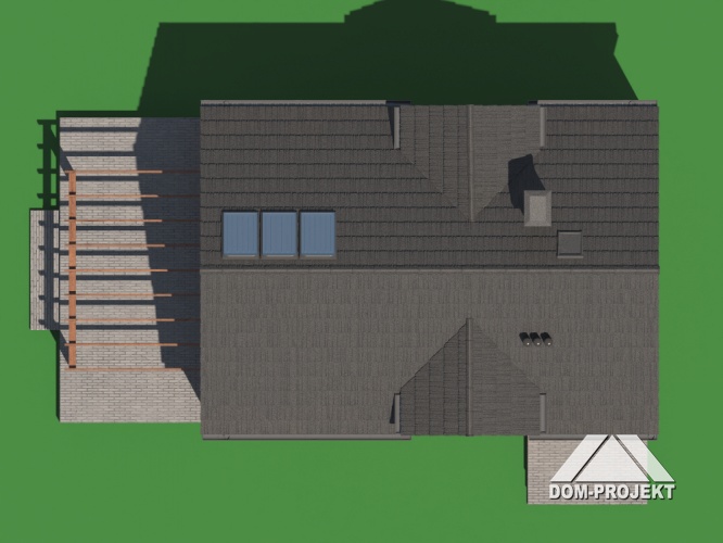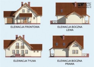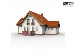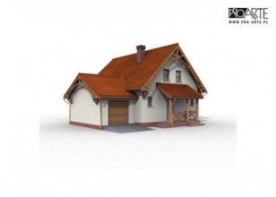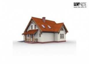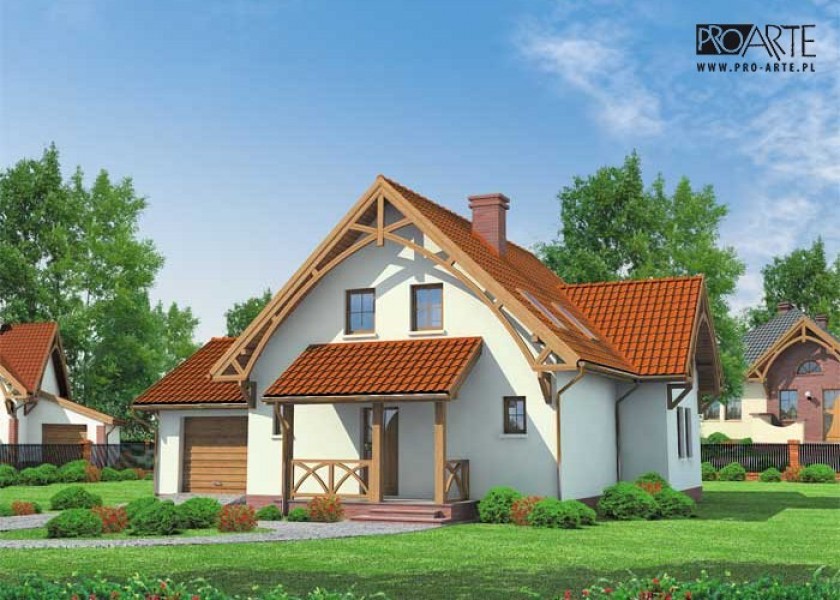 "Las Vegas" Ten niewielki, sympatyczny dom wyróżnia się bardzo zgrabną, harmonijną sylwetką. Przyjazne wrażenie wywołuje wejście, mieszczące się pod wspartym na drewnianych filarach daszkiem. Warto zwrócić uwagę na ciekawa elewację ogrodową, w której dominującym elementem są duże, symetrycznie rozmieszczone okna i przeszklone drzwi wiodące na taras. Lekkie drewniane balustrady, łagodne łuki w szczycie dachu i zgrabny murek z klinkierowanej cegły dodają budynkowi uroku i lekkości. Głównym pomieszczeniem na parterze jest obszerny pokój dzienny, połączony z usytuowaną w jasnym kąciku jadalnią (ta z kolei tworzy całość z funkcjonalna kuchnią). Na tym samym poziomie znajduje się także łazienka, pralnia i kotłownia, z której można wejść do garażu, a także wiatrołap z praktyczną