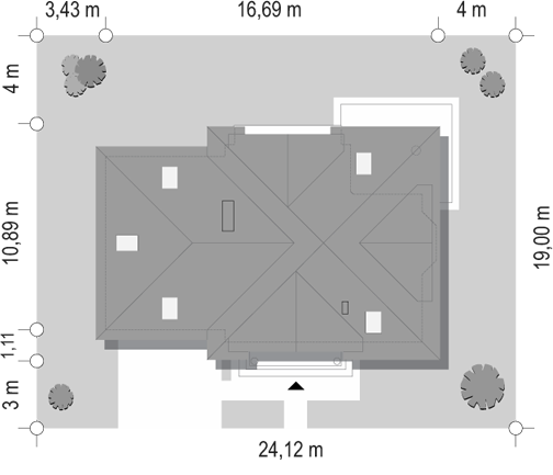 Niewielki dom o prostej bryle, niepodpiwniczony. Budynek posiada trzy sypialnie na poddaszu oraz gabinet na parterze. Ściany: w systemie YTONG 36,5 cm, Stropy: żelbetowe, wylewane, Dach: dachówka, kąt nachylenia 40°
