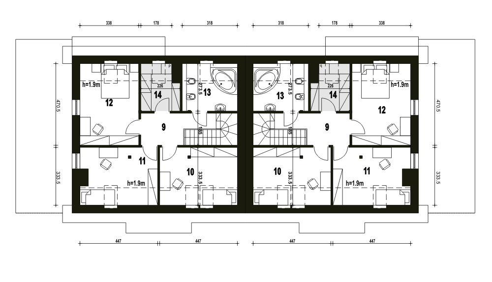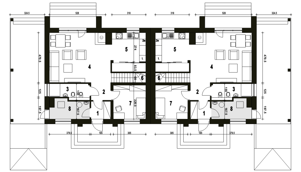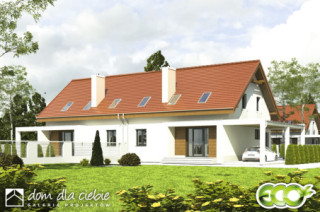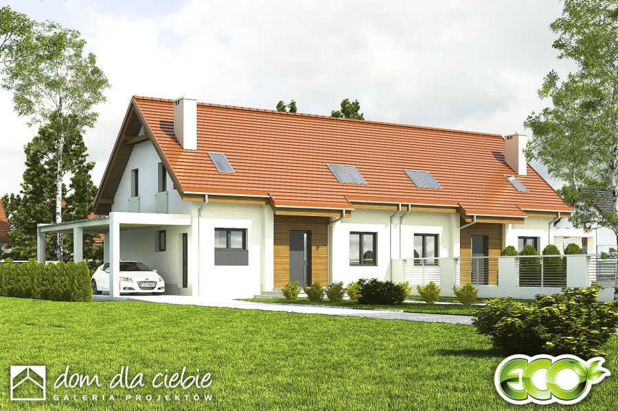(Uwaga: projekty typu bliźniak oferujemy jako domy dwulokalowe, projekt można zamówić również w zabudowie bliźniaczej) Lerka A-BL2 powstał z dwóch segmentów połączonych ścianami szczytowymi. Opis dotyczy jednego segmentu. Projekt gotowy Lerka to dom stanowiący doskonały melanż tradycji i nowoczesności. Dom charakteryzuje się prostą formą i nieskomplikowaną funkcją użytkową. Minimalizm i ład w elewacjach budynku wpływa na obniżenie kosztów budowy. Ze względu na ekonomię zrezygnowano z balkonów i lukarn, w zamian zastosowano nowoczesne okna typu porfenetr zapewniające doskonałe doświetlenie pomieszczeń. Parter stanowiący dzienną strefę domu zawiera hol, łazienkę, salon z kuchnią i spiżarnią a także dodatkowy pokój z przeznaczeniem na gabinet lub pokój gościnny. Piętro czyli strefa nocna to 3 wygodne sypialnie oraz łazienka a także garderoba z pralnią.