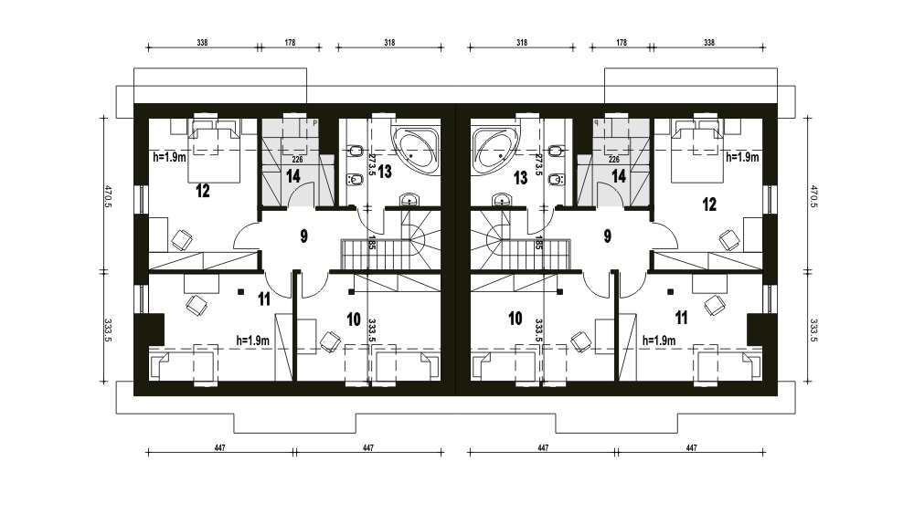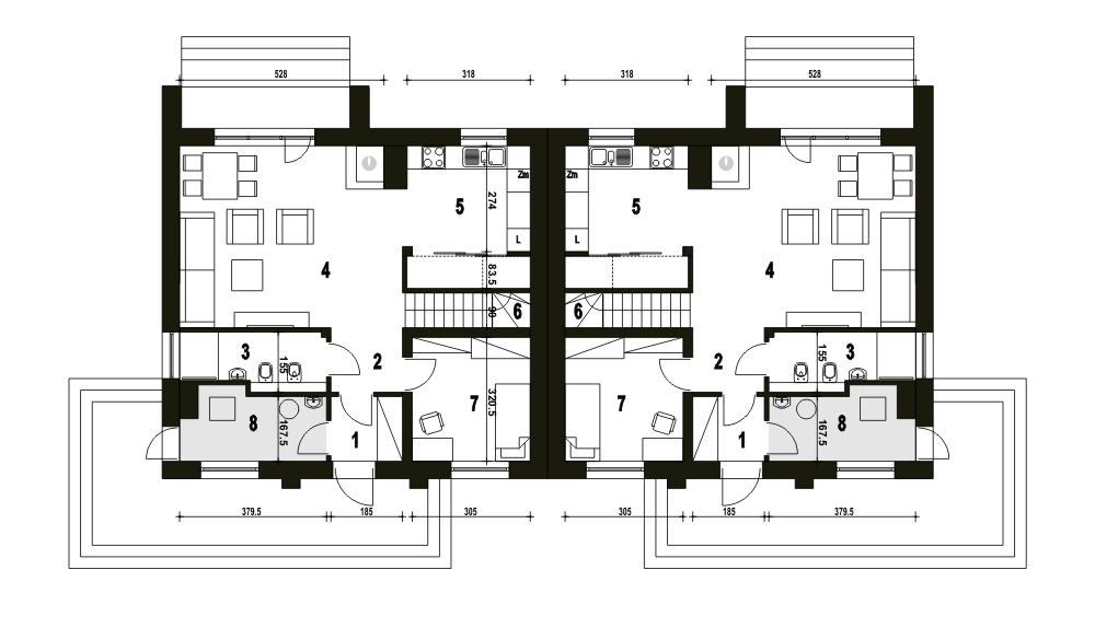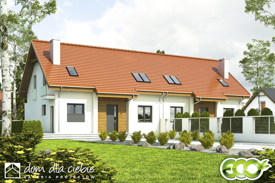 (Uwaga: projekty typu bliźniak oferujemy jako domy dwulokalowe, projekt można zamówić również w zabudowie bliźniaczej) Lerka B-BL2 powstał z dwóch segmentów połączonych ścianami szczytowymi od strony kuchni. Opis dotyczy jednego segmentu. Projekt gotowy Lerka to dom stanowiący doskonały melanż tradycji i nowoczesności. Dom charakteryzuje się prostą formą i nieskomplikowaną funkcją użytkową. Minimalizm i ład w elewacjach budynku wpływa na obniżenie kosztów budowy. Ze względu na ekonomię zrezygnowano z balkonów i lukarn, w zamian zastosowano nowoczesne okna typu porfenetr zapewniające doskonałe doświetlenie pomieszczeń. Parter stanowiący dzienną strefę domu zawiera hol, łazienkę, salon z kuchnią i spiżarnią a także dodatkowy pokój z przeznaczeniem na gabinet lub pokój gościnny. Piętro czyli strefa nocna to 3 wygodne sypialnie oraz łazienka a także garderoba z pralnią.