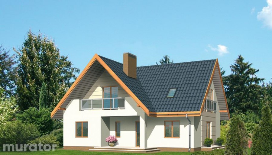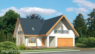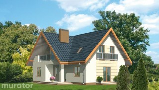 Elegancka bryła zaplanowana na rzucie w kształcie litery T. Spodoba się zwolennikom ciekawych i uniwersalnych rozwiązań. Te cechy dotyczą także <b>wnętrza</b>, które zaplanowano dbając o każdy szczegół. W domu może wygodnie zamieszkać 5-6 osobowa rodzina. Znajdzie tu zarówno wygodną przestrzeń do wspólnego spędzania czasu, jak i indywidualnej pracy, czy wypoczynku każdego z domowników. Ciekawym rozwiązaniem są połączone z dwoma sypialniami i łazienką zadaszone loggie na poddaszu – idealne miejsce na relaks. Nie zapomniano także o niezbędnym w każdym domu zapleczu gospodarczym: dużej kotłowni dostępnej zarówno z garażu, jak z <b>części mieszkalnej domu</b>, spiżarni, schowku pod schodami oraz licznych miejscach na szafy wnękowe. Mimo niewielkiej szerokości b