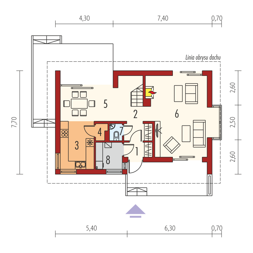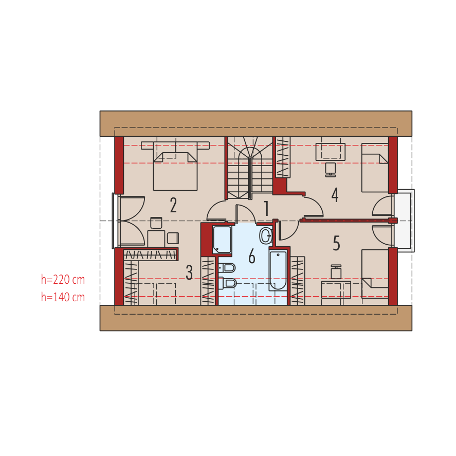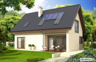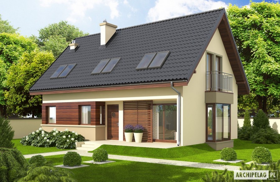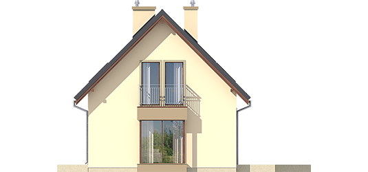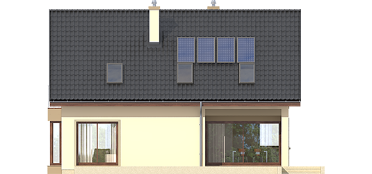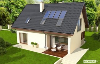 Charakterystyka: Dom parterowy z poddaszem użytkowym, niepodpiwniczony Przeznaczenie: Dom dla 3-4 osobowej rodziny Technologia i konstrukcja: Ściany zewnętrzne: dwuwarstwowe murowane Strop: międzypiętrowy gęstożebrowy Dach: konstrukcja drewniana, ocieplenie wełna mineralna, dachówka ceramiczna Röben. Więźba dachowa dostępna również w systemie prefabrykacji drewnianej Inne: schody wewnętrzne drewnianeRozwiązania instalacyjne: Ogrzewanie: kocioł gazowy, rozprowadzenie ciepła: grzejniki Wentylacja: grawitacyjna Wykończenie: Elewacje: tynk mineralny, okładzina drewniana Stolarka: drewniana lub PCV W projekcie zastosowano rozwiązania firmy VELUX.Pobierz ekspercki poradnik VELUX i dowiedz się jak wybrać okna dachoweDostępne wersje: - odbicie lustrzane Istnieje możliwość: - podpiwniczenia budynku - zbliźniaczenia - wykonania domu dwulokalowego