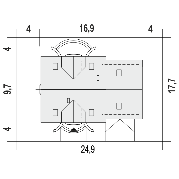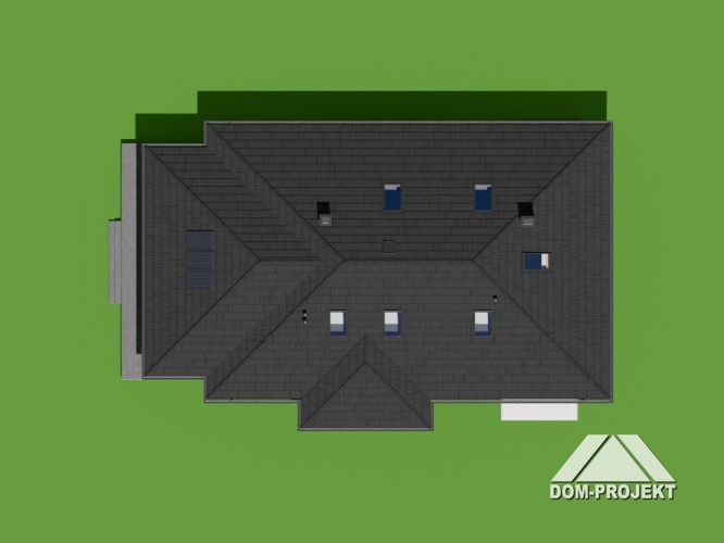 Parter jest bardzo przestrzenny i funkcjonalny. Na jego powierzchnię składa się hall, korytarz, kuchnia, jadalnia, pokój dzienny oraz gościnny i garderoba. Atutem projektu jest wygospodarowane miejsce na ogród zimowy i oranżerię. Pozostałe użytkowe pomieszczenia to łazienka, WC, pralnia z kotłownią oraz korytarz łączący z garażem dwustanowiskowym. Na poddaszu domu zaprojektowano dodatkową kuchnię, trzy sypialnie, trzy garderoby oraz dwie łazienki.