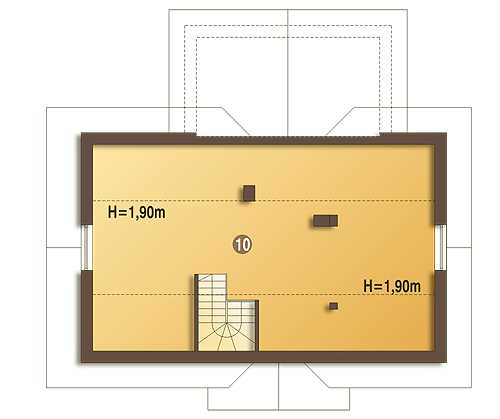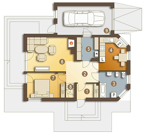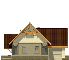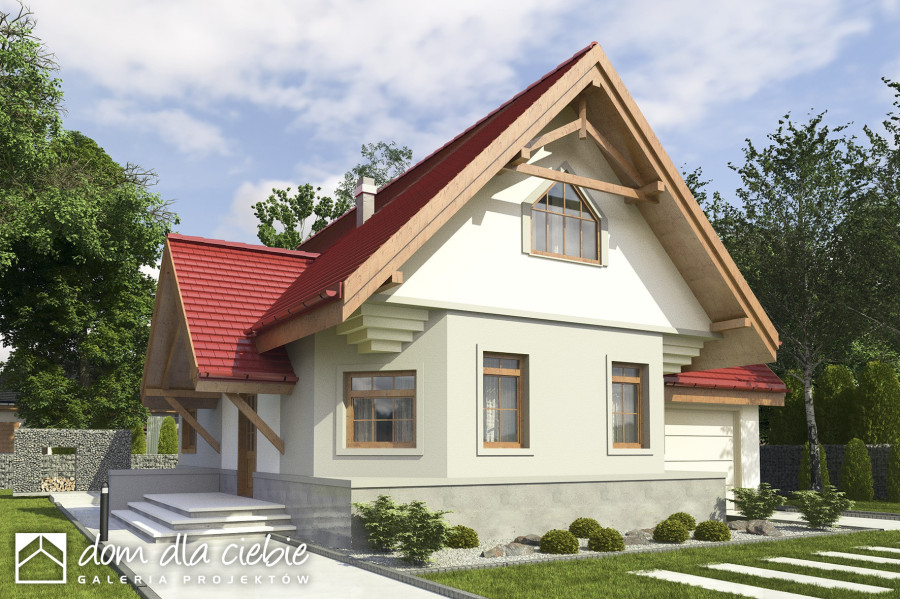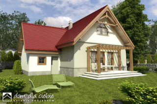 Bajkowy, niewielki dom parterowy dla małej rodziny. Funkcja mieszkalna znajduje się na parterze. Funkcja obejmuje: pokój dzienny z kominkiem i wyjściem na taras, kuchnię, pokój sypialny (również z wyjściem na taras), dużą łazienkę oraz pomieszczenie techniczne z piecem c.o - to pomieszczenie jest również przejściem do garażu. Na poddaszu, na które prowadzą niewielkie schody drewniane, znajduje się tu przestrzeń przeznaczona na potrzeby pomocnicze lub do adaptacji na dowolne cele. Dom z powodzeniem może być wykorzystany jako rekreacyjny - całoroczny.fundamenty: BETONOWE ściany zewnętrzne: PUSTAK CERAM. POROTHERM+STYROPIAN TERMO ORGANIKA ściany wewnętrzne: CEGŁ.DZIURAWKA rodzaj stropu: TERIVA elewacje: TYNK STRUKTURALNY, AKRYLOWY MOZAIKOWY pokrycie dachu: DACHÓWKA CEM. lub CER.