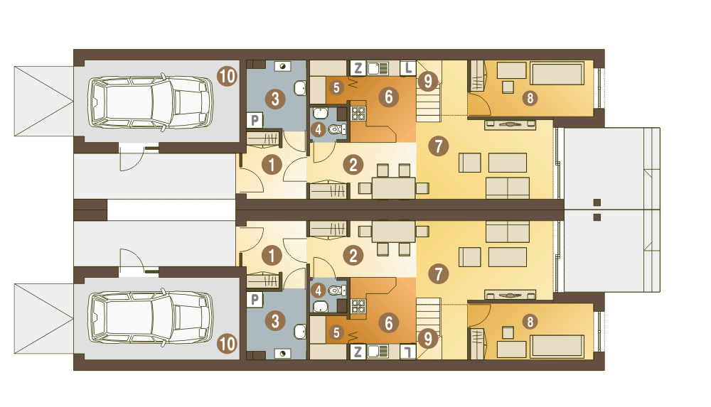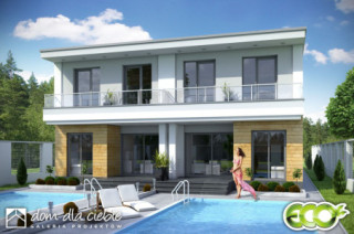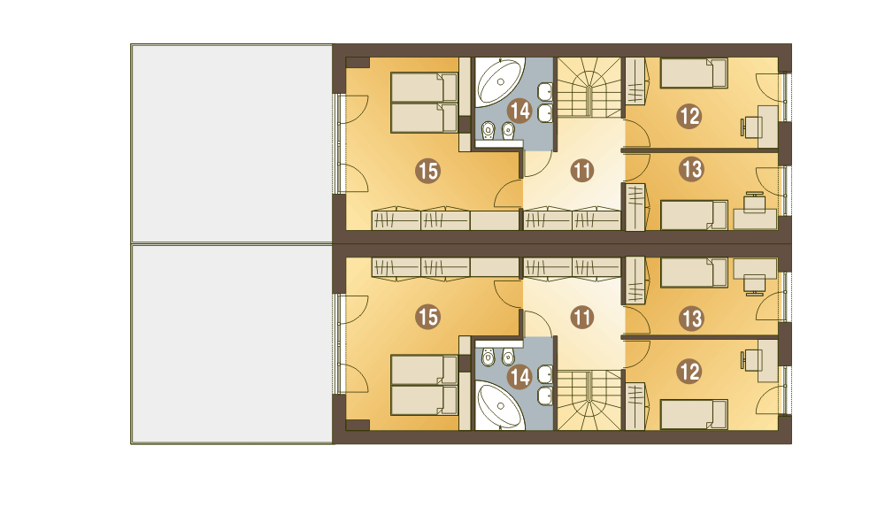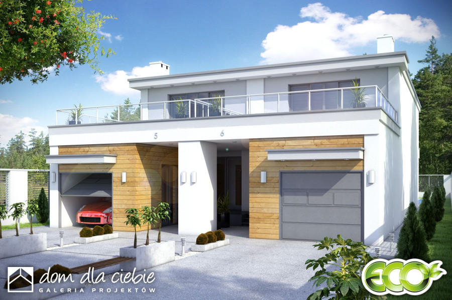 (Uwaga: projekty typu bliźniak oferujemy jako domy dwulokalowe, projekt można zamówić również w zabudowie bliźniaczej) Jeden segment to bardzo wąski piętrowy dom dla 4 lub 5-cio osobowej rodziny zaprojektowany z myślą o wąskich i nietypowych działka oraz do zabudowy bliźniaczej i szeregowej. Na parterze w strefie wejściowej znajduje się wiatrołap, hol, wc, pomieszczenie z piecem CO.W strefie dziennej zaprojektowano otwartą kuchnię ze spiżarnią, otwarty salon oraz schody. Long posiada na parterze mały gabinet (pokój gościnny), który może zostać zlikwidowany i tym samym powiększyć salon. Części mieszkalnej nie połączono bezposrednio z garażem - wyjście z garażu zaprojektowano w zadaszonej strefie wejściowej. Na pietrze znajduje się przestronna łazienka oraz trzy sypialnie, rozmieszczone wokół dużego wygodnego holu z szafami.