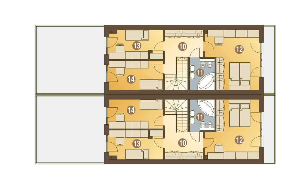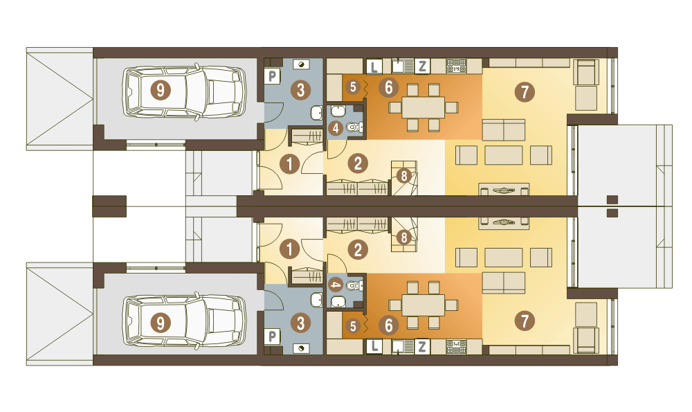 (Uwaga: projekty typu bliźniak oferujemy jako domy dwulokalowe, projekt można zamówić również w zabudowie bliźniaczej) Poniższy opis dotyczy jednego segmentu. Long II to bardzo wąski piętrowy dom dla 4 lub 5-cio osobowej rodziny zaprojektowany z myślą o wąskich i nietypowych działkach oraz do zabudowy bliźniaczej i szeregowej. Na parterze w strefie wejściowej zlokalizowano wiatrołap, hol, wc, pomieszczenie z piecem CO.W strefie dziennej zaprojektowano otwartą kuchnię ze spiżarnią, otwarty salon oraz schody. Część mieszkalna jest połączona z garażem - przejście poprzez wiatrołap i pomieszczenie gospodarcze. Na piętrze umieszczono przestronną łazienkę oraz trzy sypialnie, rozplanowane wokół dużego wygodnego holu z szafami.