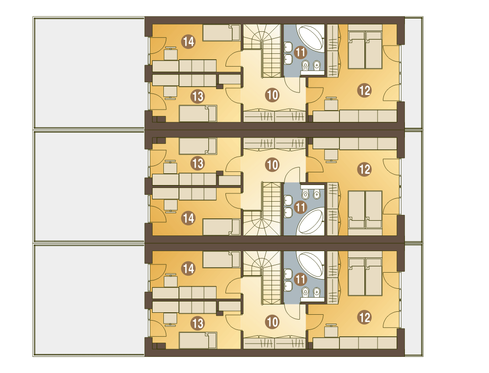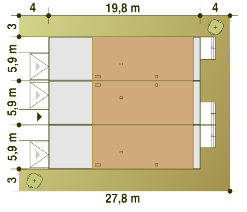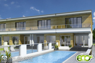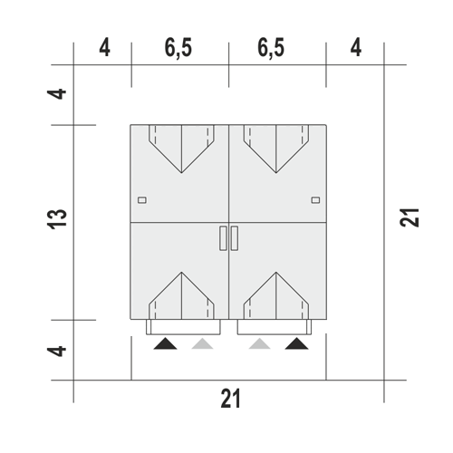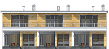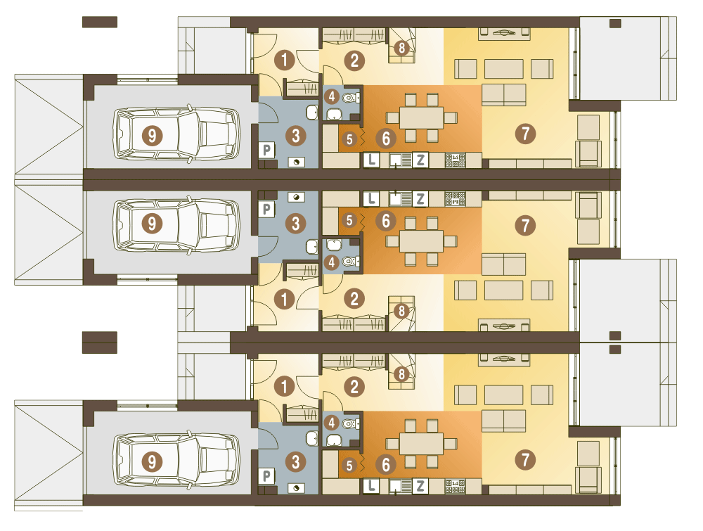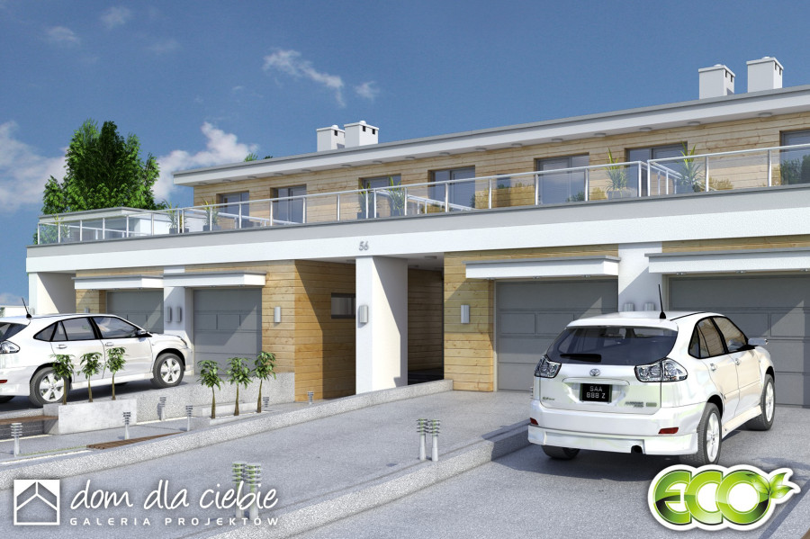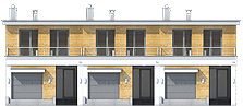 Poniższy opis dotyczy jednego segmentu: Long II to bardzo wąski piętrowy dom dla 4 lub 5-cio osobowej rodziny zaprojektowany z myślą o wąskich i nietypowych działkach oraz do zabudowy bliźniaczej i szeregowej. Na parterze w strefie wejściowej zlokalizowano wiatrołap, hol, wc, pomieszczenie z piecem CO.W strefie dziennej zaprojektowano otwartą kuchnię ze spiżarnią, otwarty salon oraz schody. Część mieszkalna jest połączona z garażem - przejście poprzez wiatrołap i pomieszczenie gospodarcze. Na piętrze umieszczono przestronną łazienkę oraz trzy sypialnie, rozplanowane wokół dużego wygodnego holu z szafami.