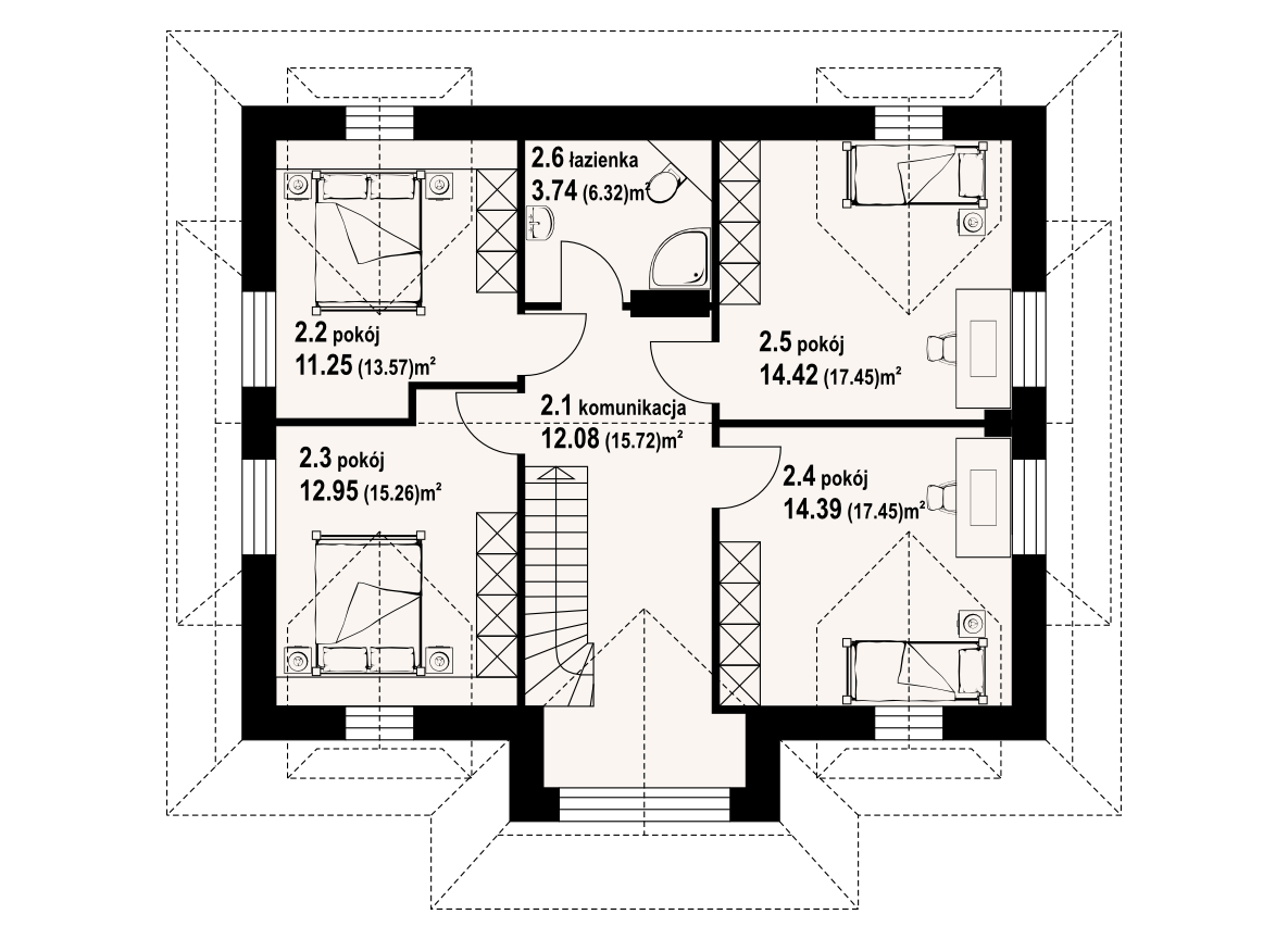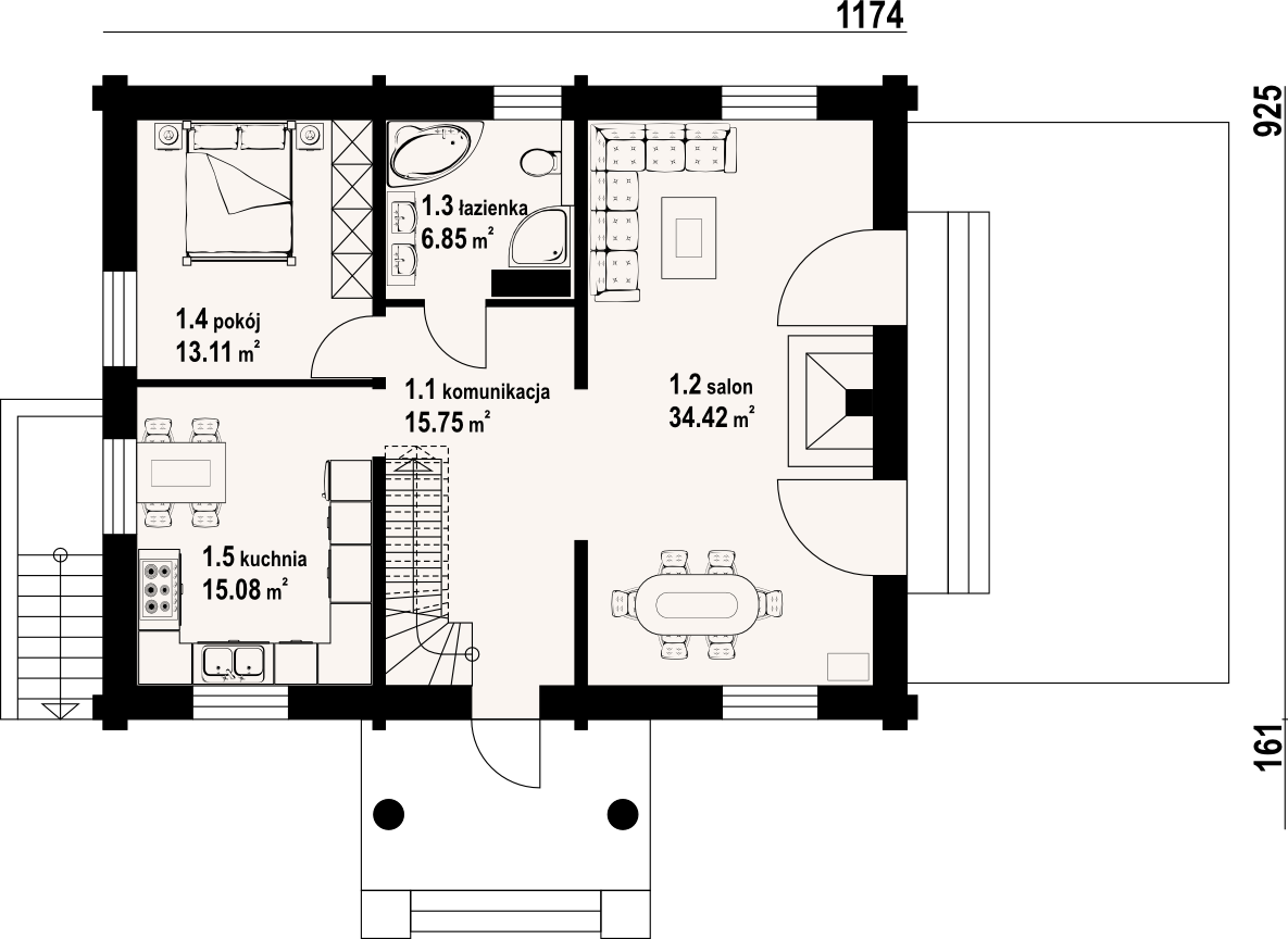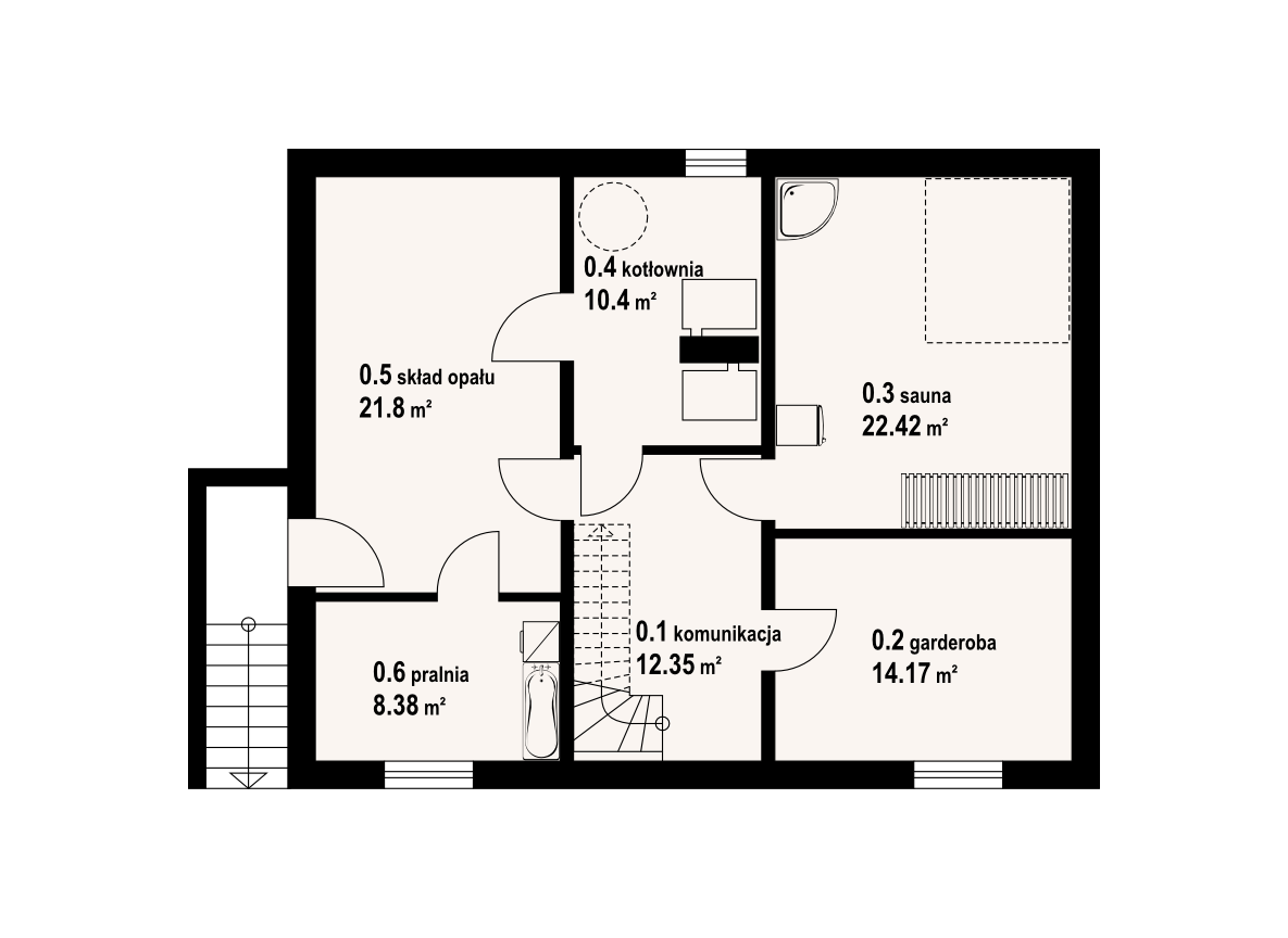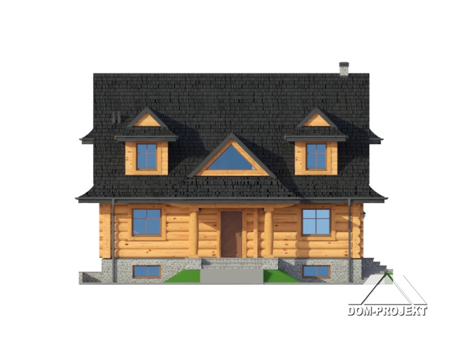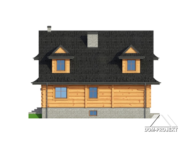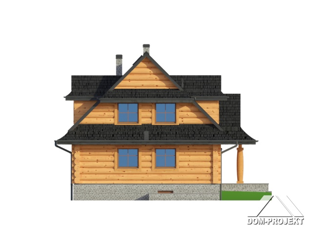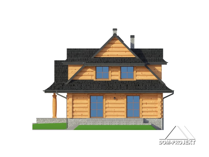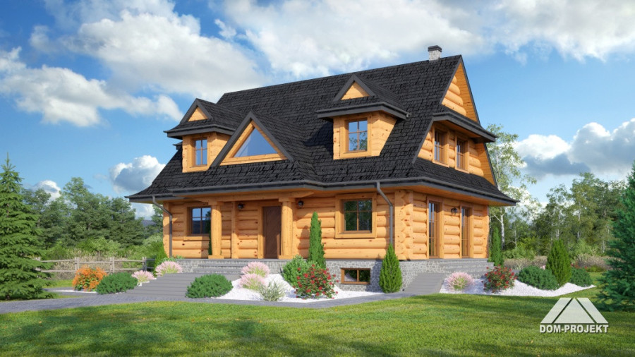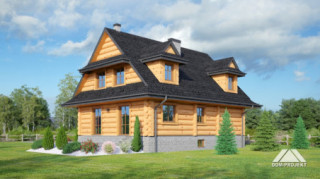 Dom z bali drewnianych. Architektura domu nawiązuje do tradycji podhalańskich. Duży salon z kominkiem i wyjściem na taras. Kuchnia, pokój, łazienka i komunikacja. Na poddaszu cztery pokoje, łazienka i komunikacja. W piwnicach kotłownia, skład opału, pralnia, sauna, garderoba i komunikacja. Zwarta bryła budynku.