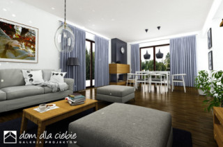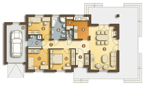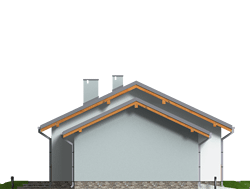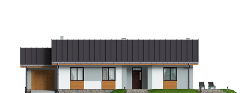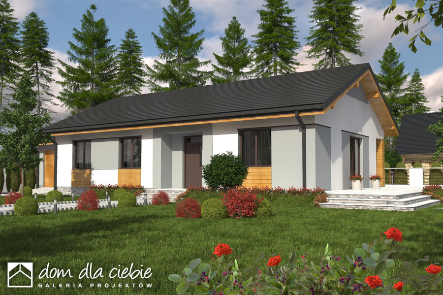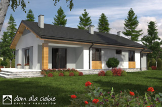 Klasyczny mały dom parterowy z prostym, dwuspadowym dachem dla 4-osobowej rodziny. Duży salon doświetlony z trzech stron daje możliwość otwarcia na różne strony świata – w zależności od układu działki. Częściowo zadaszony taras umożliwia jego wykorzystanie także w czasie deszczu. Podział funkcjonalny wnętrza rozdziela strefę ogólnodostępną (salon, kuchnia ze spiżarnią i WC) oraz prywatną (sypialnie i łazienka). Dobudowany z boku garaż jest dostępny przez pomieszczenie gospodarcze. Elewacje tego małego domu utrzymane są w ciekawej, nowoczesnej kolorystyce.fundamenty: BETONOWE ściany zewnętrzne: POROTHERM+STYROPIAN TERMO ORGANIKA ściany wewnętrzne: PUSTAK POROTHERM rodzaj stropu: TERIVA elewacje: TYNK STRUKTURALNY/OKŁ. DREWNOPODOBNA pokrycie dachu: DACHÓWKA CERAMICZNA