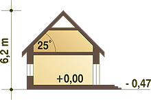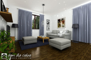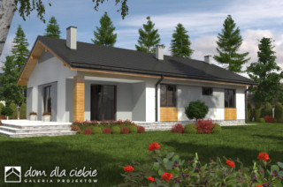 Klasyczny dom parterowy z prostym, dwuspadowym dachem dla 4-osobowej rodziny. Duży salon doświetlony z trzech stron daje możliwość otwarcia na różne strony świata – w zależności od układu działki. Częściowo zadaszony taras umożliwia jego wykorzystanie także w czasie deszczu. Podział funkcjonalny wnętrza rozdziela strefę ogólnodostępną (salon, kuchnia ze spiżarnią i WC) oraz prywatną (sypialnie i łazienka). Elewacje utrzymane w ciekawej, nowoczesnej kolorystyce. Polecamy!