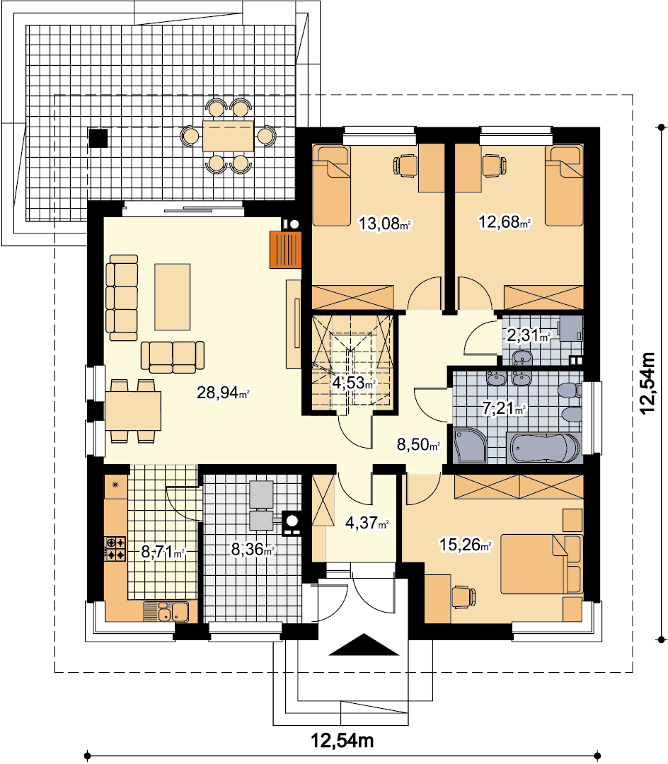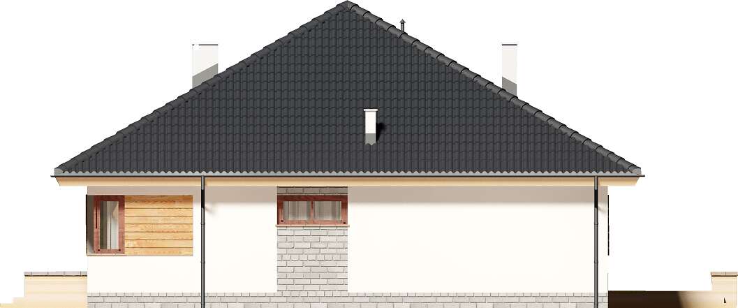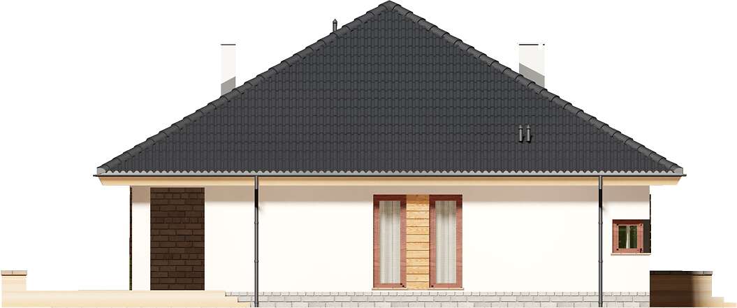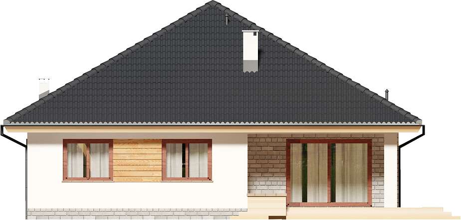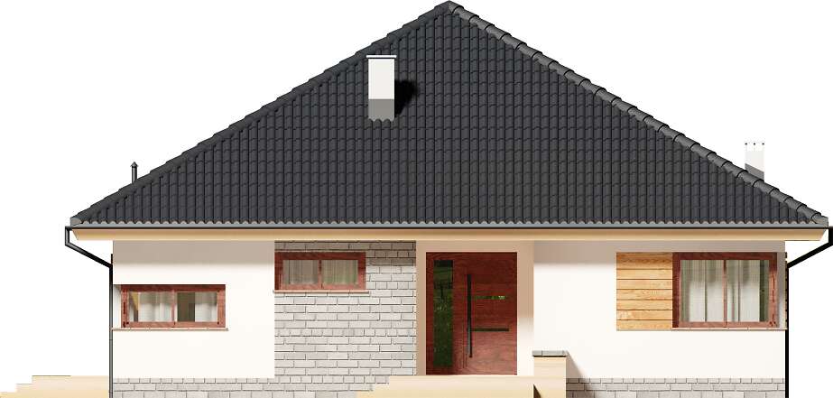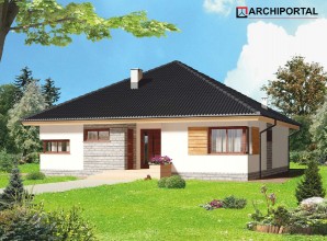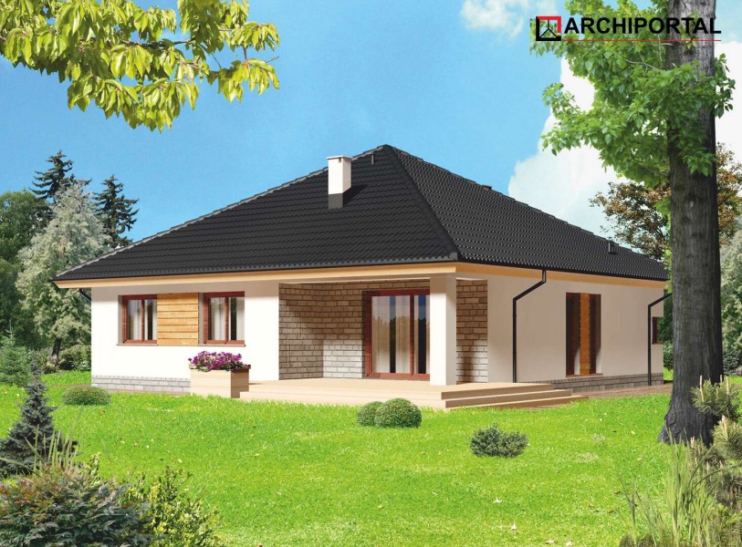 Nowoczesny, parterowy dom przeznaczony dla 3-4 osobowej rodziny. Do dyspozycji mieszkańców, jest jasny, przestronny salon, otwarta kuchnia, trzy ustawne pokoje, łazienka oraz pralnia. Z pokoju dziennego wychodzimy wprost na taras. Projektant nie zapomniał o praktycznym podcieniu, który latem daje schronienie przed słońcem. W bezpośrednim sąsiedztwie kuchni znajduje się pomieszczenie gospodarcze, z którego można wydostać się także na zewnątrz budynku. W domu zaprojektowano ogrzewanie na paliwo stałe, można je jednak zmienić na etapie adaptacji np. na gazowe. Prawdziwą zaletą jest jednak obszerna garderoba, która znajduje się na wprost wejścia do domu. Można ją połączyć z jednym z pokojów lub usunąć zyskując miejsce na schody prowadzące na strych. Przestrzeń na poddaszu możemy zaadoptować na gabinet lub pokój hobby. Narożne okna, drewniana okładzina sprawiają, że budynek ma nowoczesny, niebanalny charakter, natomiast zwarta, nieskomplikowana bryła, oparta na kwadracie, powoduje, że dom jest prosty i tani w budowie oraz późniejszej eksploatacji.