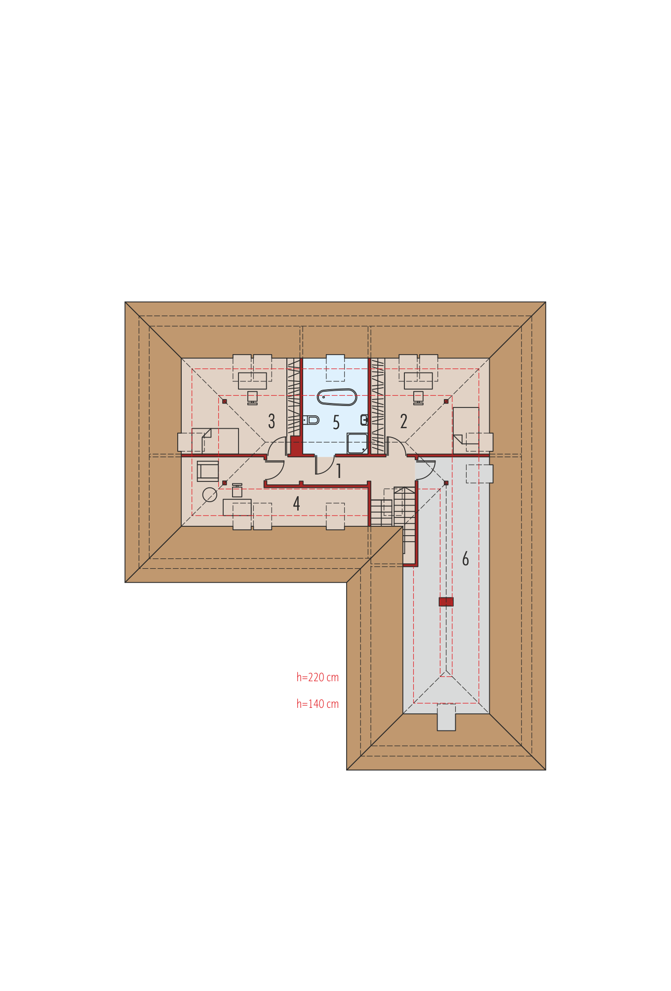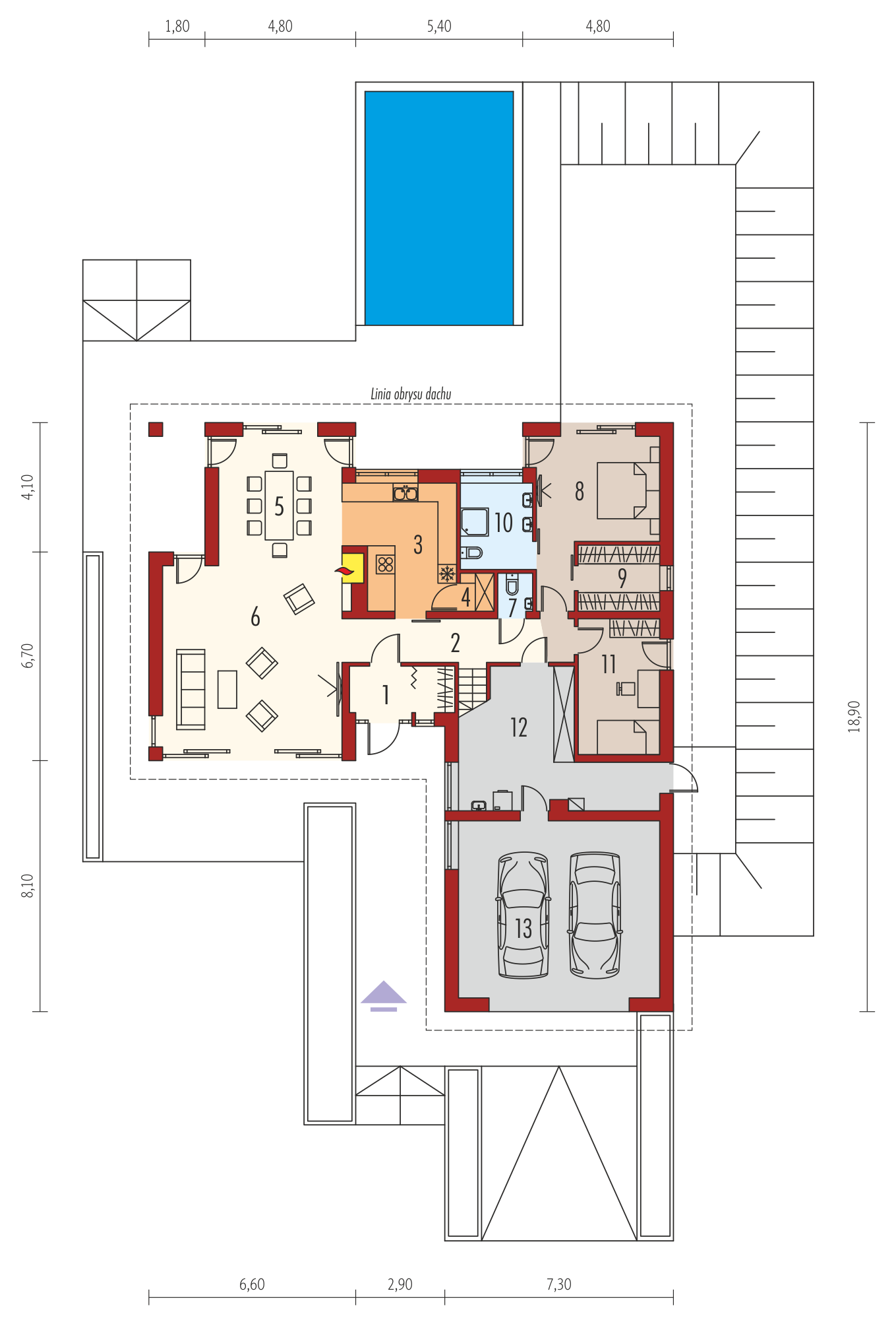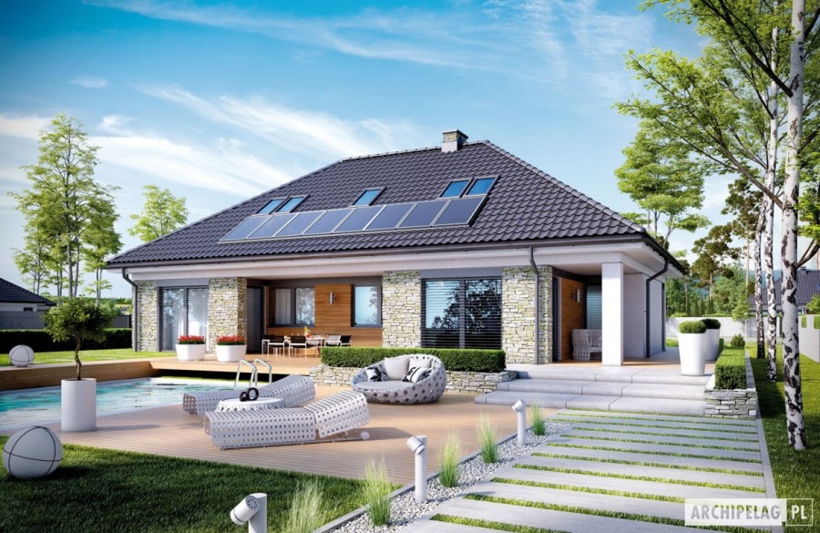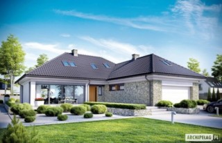 W projekcie zastosowano systemy zabudowy ścian działowych i sufitów podwieszanych Rigips.Charakterystyka: Dom parterowy z poddaszem użytkowym, niepodpiwniczony, z garażem dwustanowiskowym Przeznaczenie: Dom dla 5-6-osobowej rodzinyTechnologia i konstrukcja: Fundamenty: ławy, bloczki betonowe 24 cm, ocieplenie styropian 15 cm Ściany zewnętrzne: murowane, dwuwarstwowe, beton komórkowy firmy H+H 24 cm, ocieplenie 20 cm Ściany wewnętrzne: nośne murowane, beton komórkowy firmy H+H 24 cm, ścianki działowe w systemie Rigips 12 cm Strop: międzypiętrowy gęstożebrowy Teriva Dach: konstrukcja drewniana, ocieplenie wełna mineralna ISOVER 30 cm, dachówka cementowa IBF Inne: schody wewnętrzne drewnianeRozwiązania instalacyjne: Ogrzewanie: kocioł gazowy kondensacyjny, rozprowadzenie ciepła: grzejniki Wentylacja: grawitacyjnaWykończenie: Elewacje: tynk cienkowarstwowy mineralny w kolorze TO-PA001 z palety firmy Termo Organika, okładzina z płyty HPL z naturalną okleiną drewnianą firmy Prodema i okładzina kamiennaStolarka: drewniana, PVC lub aluminiowa, drzwi wejściowe i brama garażowa firmy Hörmann Okna połaciowe: rozwiązania technologiczne firmy FAKRO, wyłaz dachowy FAKROOtoczenie: płyty tarasowe firmy LibetWersje - zapytaj o dostępność:- Magnus G2 ENERGO PLUS – podobny układ funkcjonalny parteru, dwuspadowy dach bez okapów, inne wykończenie elewacji, energooszczędne instalacje- Alberta – dom parterowy, podobny układ funkcjonalny, dach o kącie nachylenia 25°, z okapami, inne wykończenie elewacji, standardowe instalacje, garaż jedno- i dwustanowiskowy- Odbicie lustrzane do każdej wersjiIstnieje techniczna możliwość: - podpiwniczenia budynku - wykonania budynku w technologii szkieletowejAtuty projektu okiem architekta: - Ścianki wewnętrzne w technologii lekkiej umożliwiają dowolną aranżację wnętrz - Współczesny charakter domu: tradycyjna forma ubrana w nowoczesną szatę materiałowo-kolorystyczną - Bryła o bardzo dobrych parametrach cieplnych - Funkcjonalne i ergonomiczne wnętrze z podziałem na strefę dzienną na parterze i nocną na poddaszu - Dodatkowe pokoje na parterze spełnią wymagania większej rodziny - Ciekawie rozplanowana nowoczesna kuchnia z praktycznym schowkiem - spiżarką - Reprezentacyjny salon z kominkiem i doskonałym doświetleniem - Strefa wypoczynkowa ogrodu dostępna aż z trzech stron świata - Świetny widok z kuchni i łazienki na ogród