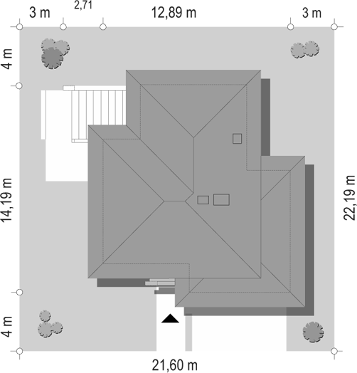 Klasyczny dom z dachem kopertowym z bryłą garażu wysuniętą do przodu i charakterystycznym przeszklonym wykuszem od strony ogrodu. We wnętrzu ciekawa jest pustka nad jadalnią i kominek z wolnostojacą ścianą przy schodach.