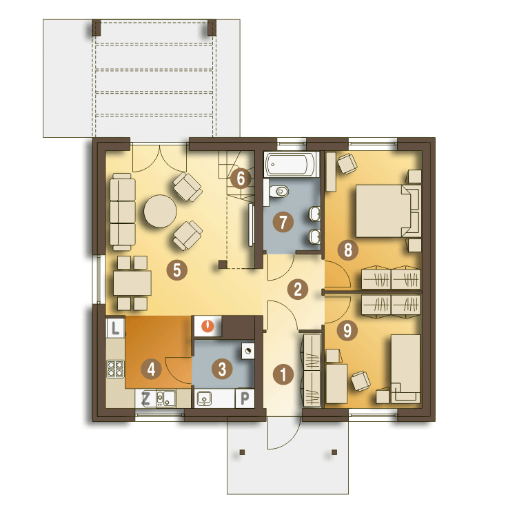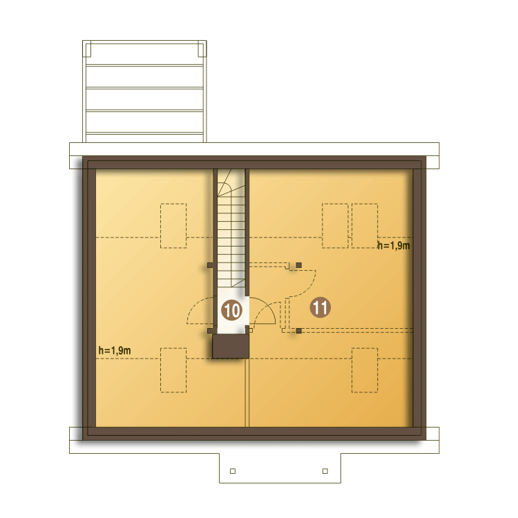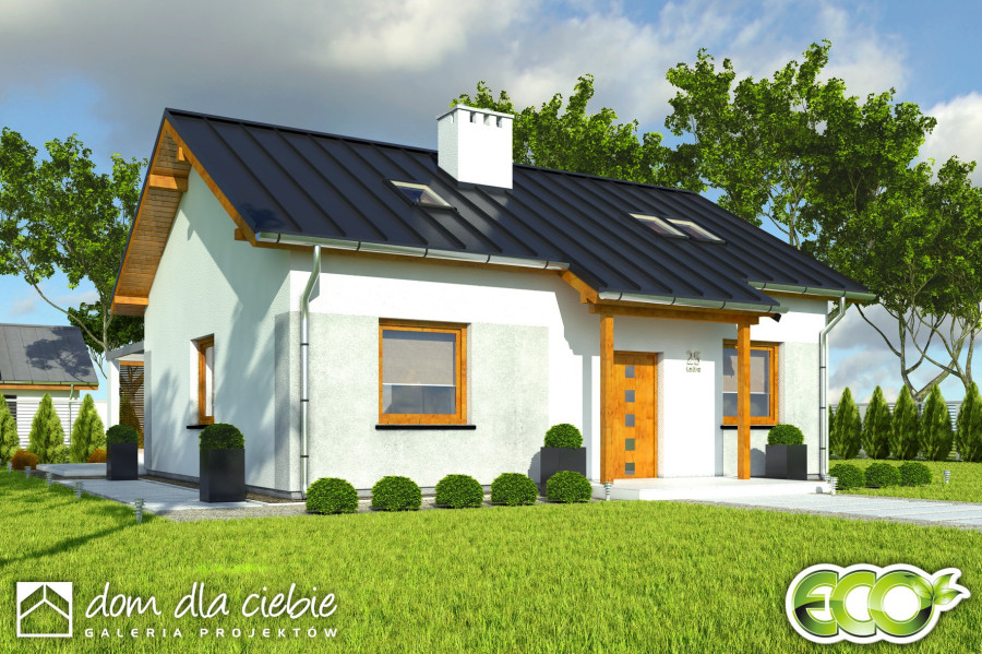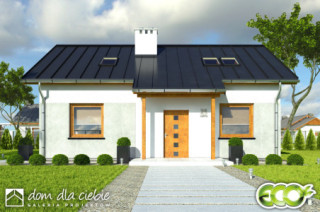 Projekt parterowego domu jednorodzinnego Marcin zaprojektowany jest z myślą o 3 do 4 osobowej rodzinie. Marcin to projekt domu z poddaszem przeznaczonym do indywidualnej adaptacji. To dom z serii ECO, tani w budowie i utrzymaniu. Dach zaprojektowany jest na tradycyjnej więźbie dachowej z nachyleniem pozwala na wykorzystanie poddasza na cele użytkowe. Na dostaniemy się przez zabiegowe schody usytuowane w salonie. Przestrzeń poddasza można zaprojektować jako użytkową na etapie adaptacji projektu i uzyskać dzięki temu trzy dodatkowe pomieszczenia (pokazane na rzucie linią przerywaną). Po mimo niewielkiej powierzchni, projekt domu Marcin przewiduje podział na część ogólnodostępną, w której mamy do dyspozycji salon z kominkiem i miejscem do spożywania posiłków oraz kuchnię i kotłownię gazową z pralnią. W części prywatnej mamy zaprojektowano dwie sypialnie i wygodną wspólną łazienkę z oknem skierowanym na ogród. Wygodny wiatrołap z miejscem w którym udało się zmieścić dwie wygodne szafy wnękowe oraz nieduży hol to wygodna część wejściowa domu. Projekt domu Marcin to bardzo praktyczna propozycja dla osób szukających, przemyślanych rozwiązań architektonicznych, zapewniających nieduże koszty budowy. Prosta bryła budynku i dwuspadowe zadaszenie to parametry, które decydują o niskim koszcie budowy tego domu.fundamenty: BETONOWE ściany zewnętrzne: POROTHERM+STYROPIAN TERMO ORGANIKA ściany wewnętrzne: POROTHERM rodzaj stropu: TERIVA elewacje: TYNK STRUKTURALNY, OKŁADZINA DREWNIANA pokrycie dachu: BLACHA NA RĄBEK STOJĄCY