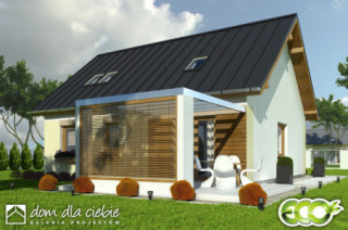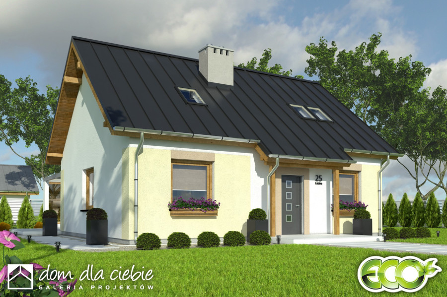 Marcin II to inna wersja projektu Marcin. W tej wersji mamy powiększony kąt nachylenia dachu do 40stopni i zaprojektowane poddasze użytkowe z dachem na ściance kolankowej wysokości 25cm. Marcin II to dom z serii ECO, czyli tani w budowie i utrzymaniu, przeznaczony jest również dla 3 do 4 osobowej. Marcin II posiada zaprojektowane poddasze z dwoma sypialniami i łazienką. Na poddasze prowadzą zabiegowe schody w narożniku salonu. Projekt przy 100m2 powierzchni użytkowej, przewiduje zachowanie podziału podział na część ogólnodostępną, w której mamy salon z miejscem do spożywania posiłków, kominkiem, kuchnią i pomieszczeniem gospodarczym z piecem na paliwo gazowe. W części prywatnej mamy przewidziane dwie sypialnie i wspólną łazienkę. W strefie wejściowej mamy natomiast wiatrołap z szafami wnękowymi oraz wygodny hol. Projekt domu Marcin II dzięki prostej bryle i prostemu zadaszeniu, gwarantuje niskie koszty budowy tego domu. Projekt posiada kompletnie zaprojektowaną funkcję oraz standard domu energooszczędnego, dlatego praktycznie nie wymaga wprowadzania zmian na etapie adaptacji w tym zakresie.fundamenty: BETONOWE ściany zewnętrzne: POROTHERM+STYROPIAN TERMO ORGANIKA ściany wewnętrzne: POROTHERM rodzaj stropu: TERIVA elewacje: TYNK STRUKTURALNY, OKŁADZINA DREWNIANA pokrycie dachu: BLACHA NA RĄBEK STOJĄCY