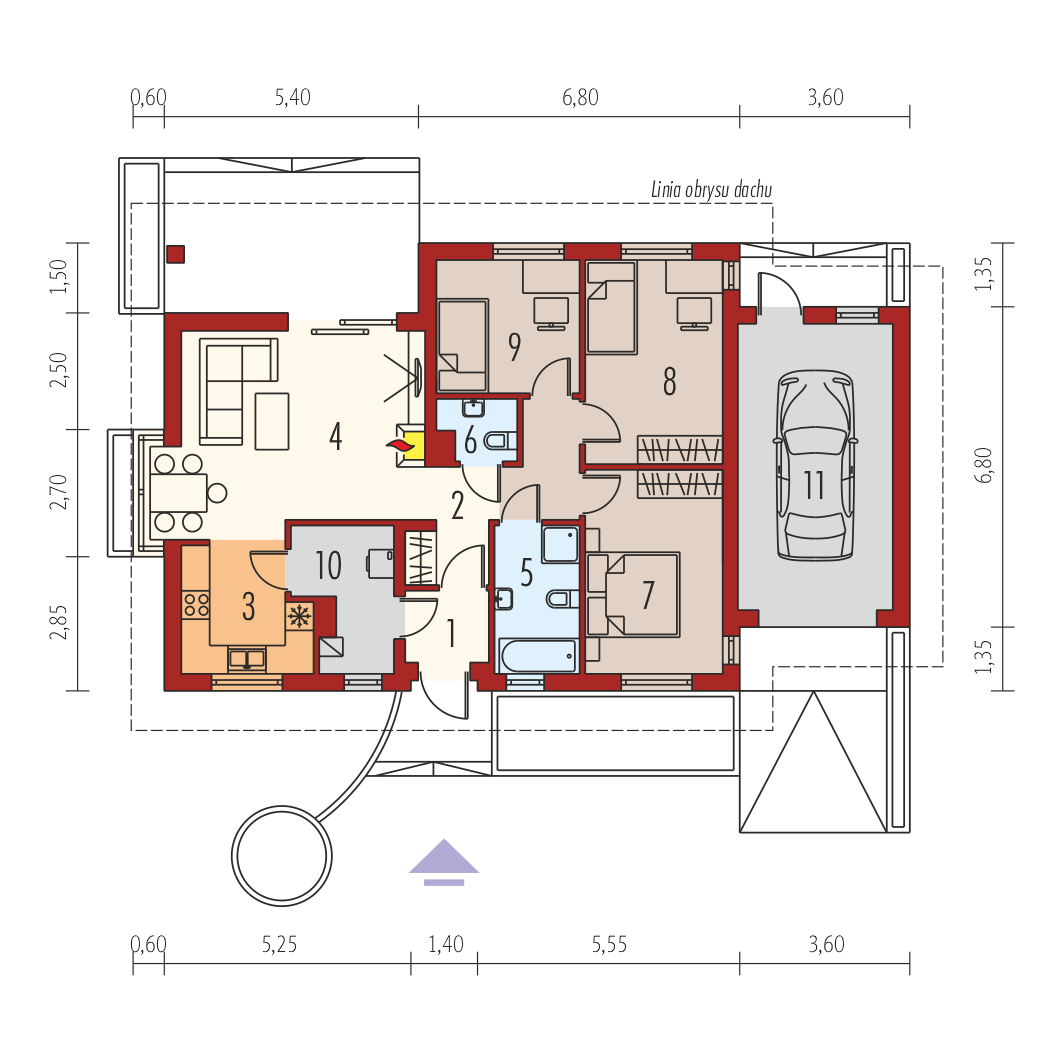 Istnieje możliwość zmiany kąta nachylenia dachu do 30° oraz adaptacji poddasza na strych.Charakterystyka: Dom parterowy, niepodpiwniczony, z garażem jednostanowiskowym Przeznaczenie: Dom dla 3-4 osobowej rodziny Technologia i konstrukcja: Ściany zewnętrzne: murowane, Strop: gęstożebrowy Dach: konstrukcja drewniana, dachówka ceramiczna firmy Röben Rozwiązania instalacyjne: Ogrzewanie: kocioł gazowy, rozprowadzenie ciepła: grzejniki Wentylacja: grawitacyjna Wykończenie: Elewacje: tynk mineralny, okładzina drewniana i kamienna lub klinkierowa, cokół kamienny Stolarka: drewniana lub PCV, drzwi wejściowe i brama garażowa firmy HörmannWersje domów w serii Margo - zapytaj o dostępność: - Margo – wersja podstawowa, dom parterowy, 3 sypialnie, dach o kącie nachylenia 25°, różne wersje garaży: bez garażu, z garażem jedno- lub dwustanowiskowym - Margo Mocca – inna propozycja wykończenia materiałowo-kolorystycznego elewacji, różne wersje garaży - Margo MULTI-COMFORT – dom z rozwiązaniami materiałowo-kolorystycznymi Grupy Saint-Gobain, różne wersje garaży - Margo (30°) – wersje z dachem o kącie nachylenia 30° i dodatkową przestrzenią strychową na poddaszu, różne wersje garaży - każda wersja z inną propozycją wykończenia elewacji - odbicie lustrzane do wszystkich wersji Wszystkie wersje domów możliwe w dwóch standardach/wariantach instalacyjnych: - STANDARD: piec gazowy kondensacyjny, grzejniki, wentylacja grawitacyjna - ENERGO PLUS: pompa ciepła, ogrzewanie podłogowe, wentylacja mechaniczna, dodatkowo panele fotowoltaiczne Istnieje techniczna możliwość: - podpiwniczenia budynku- wykonania budynku w technologii szkieletowej