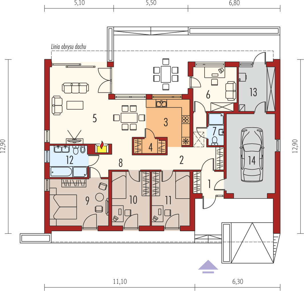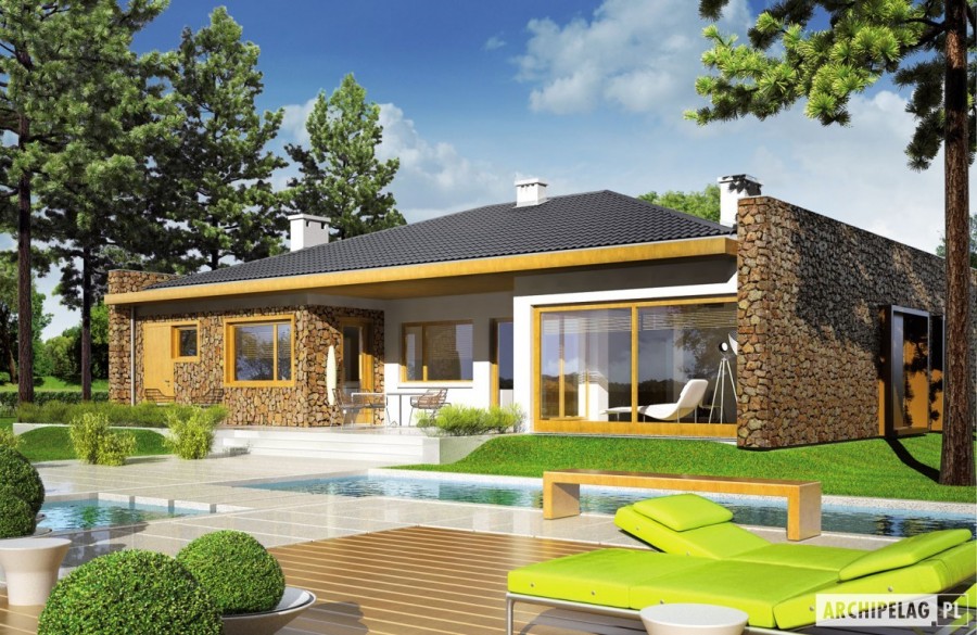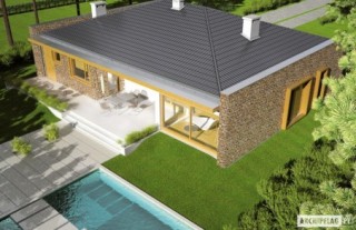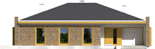 Charakterystyka: Dom parterowy, niepodpiwniczony, z garażem jednostanowiskowymPrzeznaczenie: Dom dla 3-5-osobowej rodziny Technologia i konstrukcja:Ściany zewnętrzne: murowane, dwuwarstwowe, beton komórkowy Ytong 24 cm, ocieplenie wełna mineralna 12 cmStrop: gęstożebrowy Teriva, ocieplenie wełna mineralna firmy Isover 30 cmDach: konstrukcja drewniana, dachówka ceramiczna płaska Bergamo firmy RöbenRozwiązania instalacyjne:Ogrzewanie: kocioł gazowy kondensacyjny firmy Viessmann, rozprowadzenie ciepła: grzejniki firmy PurmoWentylacja: grawitacyjna OZE: kolektory słoneczne firmy Viessmann Dodatkowo: stacja uzdatniania wody firmy ViessmannWykończenie:Elewacje: tynk cienkowarstwowy mineralny, np. w kolorze TO-PA001 z palety firmy Termo Organika, okładzina kamienna i drewnianaStolarka: drewniana, PVC lub aluminiowa, rolety zewnętrzne w systemie CleverBox firmy BeClever, drzwi wejściowe i brama garażowa firmy HörmannWersje - zapytaj o dostępność:- Marlon G1 – podobny układ funkcjonalny, garaż jednostanowiskowy- Marlon II G1 (z wejściem od południa) – podobny układ funkcjonalny, garaż jednostanowiskowy- Marlon III G1 (biały) – inne wykończenie elewacji- Marlon IV G1 (z wejściem od południa) - podobny układ funkcjonalny, garaż jednostanowiskowy Wersja z dachem o kącie nachylenia 30°: - Marlon III G1 (biały) 30 stopni - każda wersja z inną propozycją wykończenia elewacji- odbicie lustrzane do każdej wersjiIstnieje techniczna możliwość:- podpiwniczenia budynku- zmiany kąta nachylenia dachu do 30º oraz adaptacji poddasza na strych- wykonania budynku w technologii szkieletowej