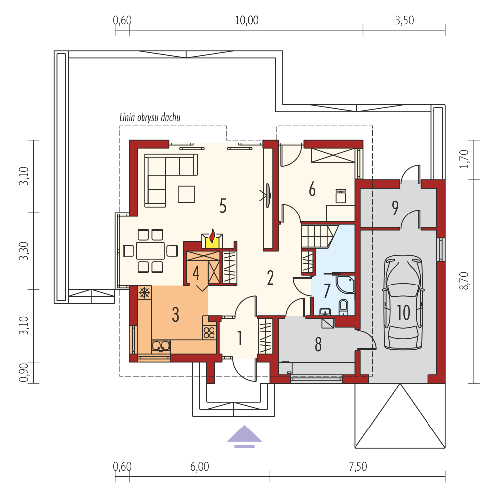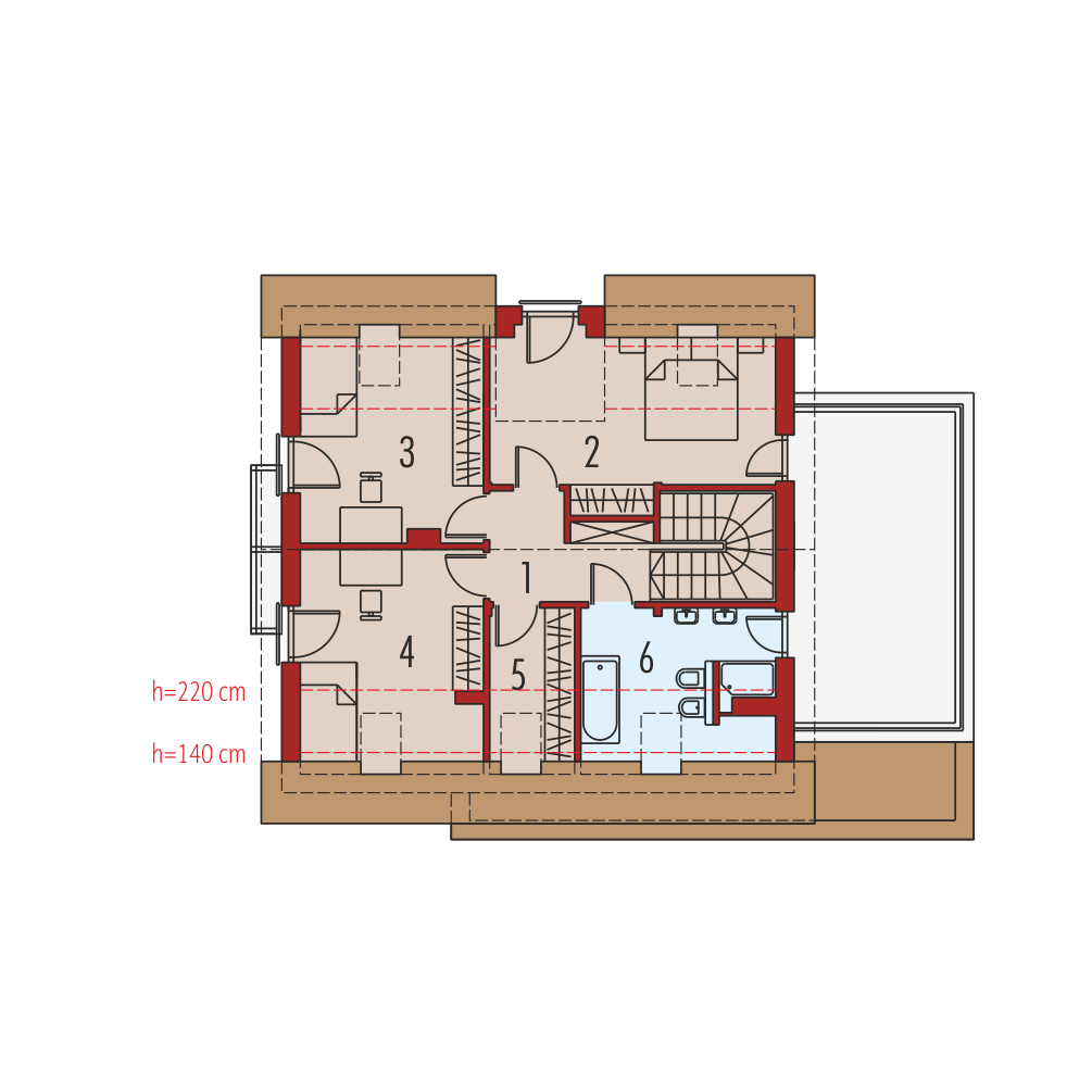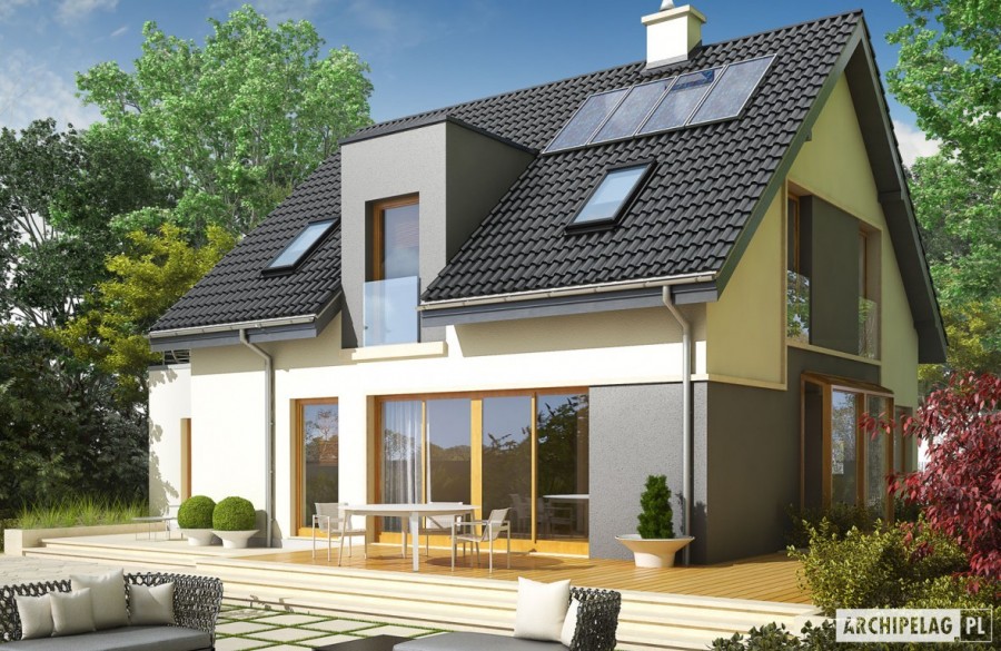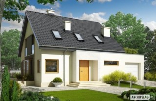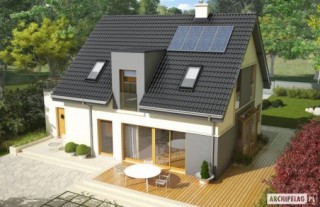 Charakterystyka: Dom parterowy z poddaszem użytkowym, niepodpiwniczony, z garażem jednostanowiskowym Przeznaczenie: Dom dla 4-5 osobowej rodziny Technologia i konstrukcja: Ściany zewnętrzne: murowane Strop: gęstożebrowy Dach: konstrukcja drewniana, ocieplenie wełna mineralna, dachówka cementowa IBF Inne: schody wewnętrzne drewnianeRozwiązania instalacyjne: Ogrzewanie: kocioł gazowy, rozprowadzenie ciepła: grzejniki Wentylacja: grawitacyjna Wykończenie: Elewacje: tynk mineralny i okładzina kamienna Stolarka: drewniana lub PCV, drzwi wejściowe i brama garażowa firmy HörmannWersje - zapytaj o dostępność: - Mati II – bez garażu - Mati II G2 - z garażem dwustanowiskowym - Mati – z inną aranżacją pomieszczeń, bez garażu lub z garażem jednostanowiskowym - Odbicia lustrzane do wszystkich wersjiIstnieje techniczna możliwość: - podpiwniczenia budynku - zbliźniaczenia - wykonania domu dwulokalowego