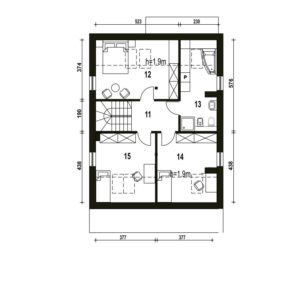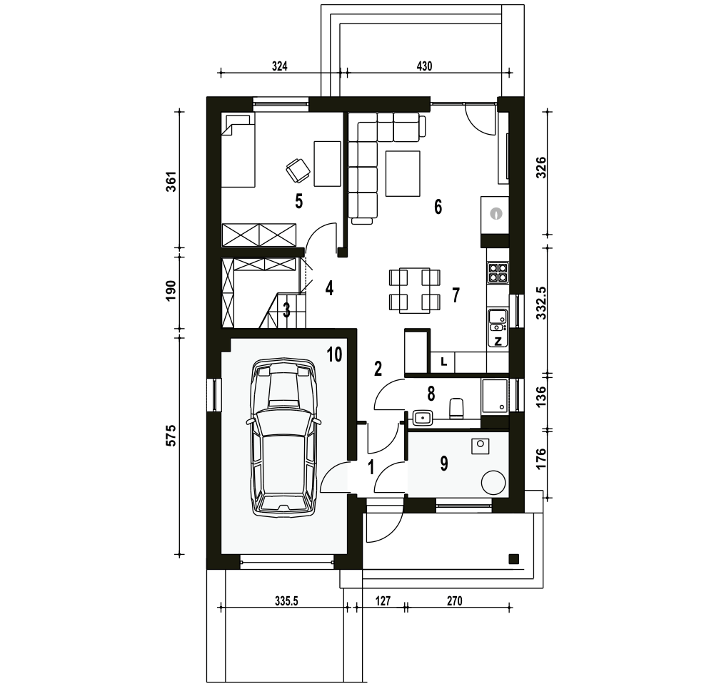 Propozycja Mazurek II to niewielki, komfortowy dom z garażem na jedno auto. Projekt poprzez prostą konstrukcję i zwartą bryłę stawia na ekonomię zarówno podczas budowy jak i w eksploatacji. Mazurek II dedykowany jest dla 4-5 osobowej rodziny. Parter budynku to salon połączony z kuchnią i jadalnią, pokój mogący pełnić rolę gabinetu lub pokoju gościnnego, nieduża łazienka, pomieszczenie techniczne z piecem. Pod schodami prowadzącymi na piętro wygospodarowano miejsce na spiżarnię albo garderobę. Piętro to 3 sypialnie, łazienka z miejscem na pralkę. Projekt przewidziany jest do zabudowy wolnostojącej, bliźniaczej oraz szeregowej.fundamenty: BETONOWE ściany zewnętrzne: POROTHERM+STYROPIAN TERMO ORGANIKA rodzaj stropu: TERIVA I elewacje: TYNK STRUKTURALNY, OKŁADZINA KLINKIEROWA pokrycie dachu: DACHÓWKA CEMENTOWA, CERAMICZNA lub BLACHA DACHÓWKO PODOBNA