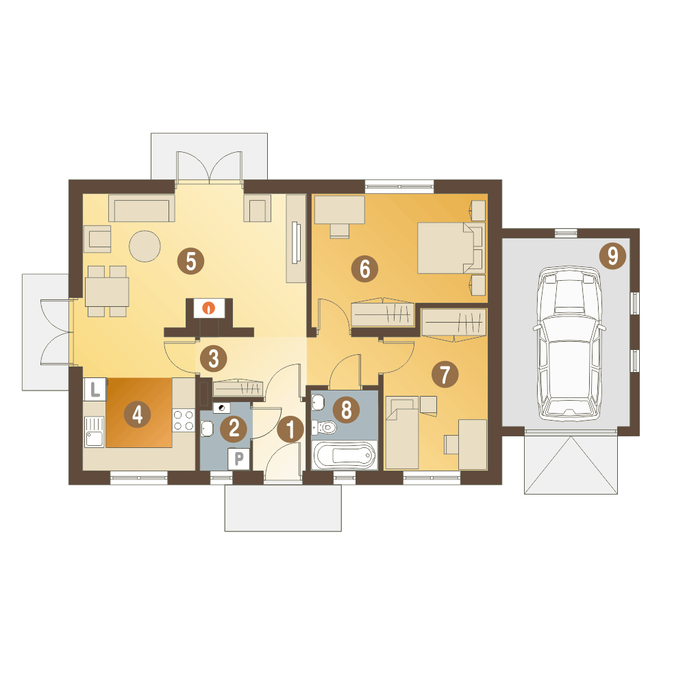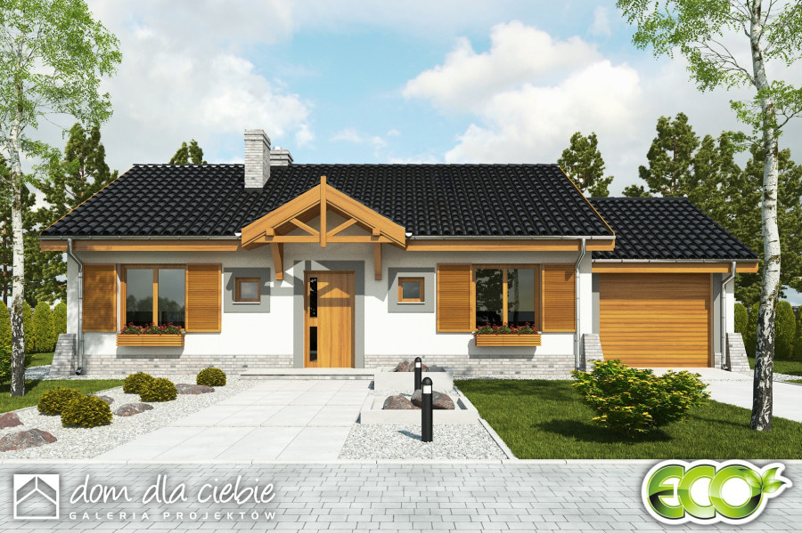 Niewielki, schludny dom mieszkalny, parterowy z przybudowanym garażem i poddaszem przeznaczonym na cele magazynowe. Pomimo niewielkiej powierzchni zachowuje podział na strefy dzienną (kuchnia, jadalnia i pok.dzienny) i nocną (2 sypialnie i łazienka). Dzięki ekonomicznej formie i funkcji MAŁGOSIA może spełniać funkcję domu rekreacyjnego... Sprawdź inne projekty domów - Zapraszamy !fundamenty: BETONOWE ściany zewnętrzne: POROTHERM+STYROPIAN ściany wewnętrzne: POROTHERM rodzaj stropu: DREWNIANY elewacje: TYNK STRUKTURALNY pokrycie dachu: DACHÓWKA CERAMICZNA
