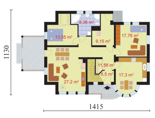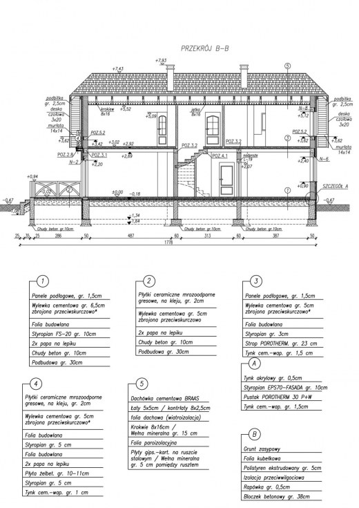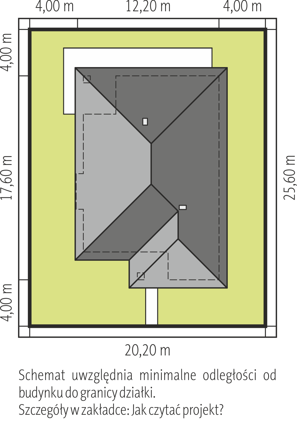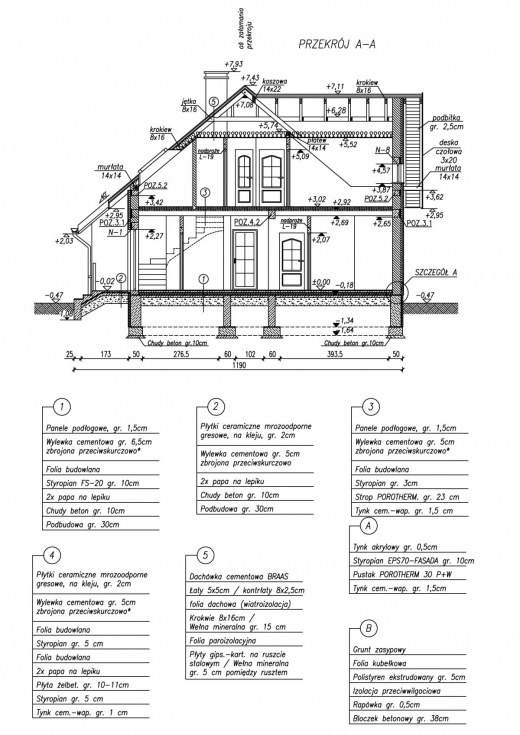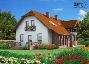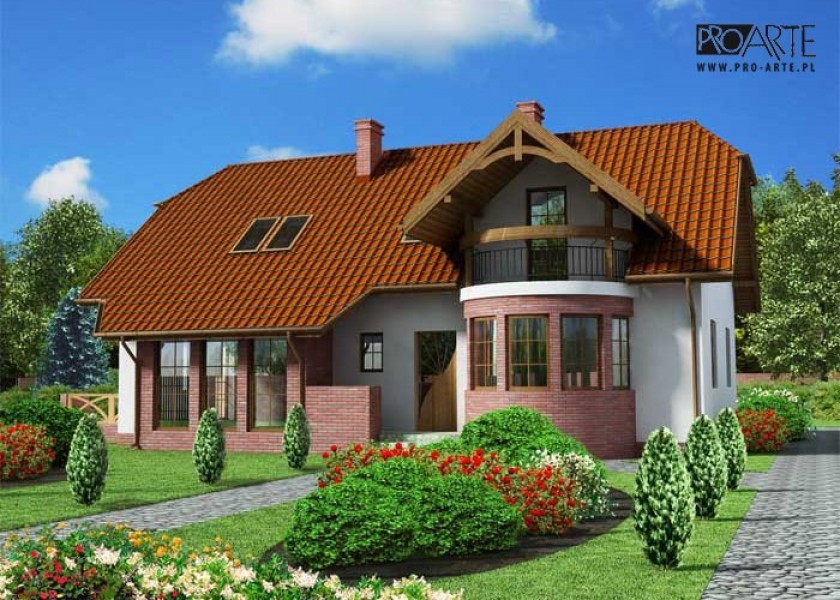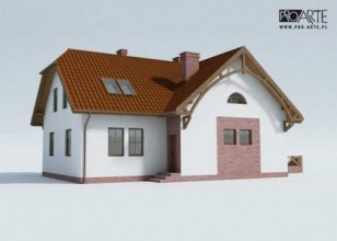 To dom przeznaczony dla dwóch rodzin, który szczyci się swoim sporym rozmiarem. Oczywiście nie jest regułą ile rodzin ma go użytkować, dlatego też może być on przytulnym gniazdkiem wyłącznie dla jednej. Wystarczy, że kochają Państwo dużą przestrzeń i przestronne pomieszczenia! Wyśmienicie prezentują się nieregularne kształty budynku szczególnie uwydatnione na jego frontowej elewacji. Dodatkowo zostały one ozdobione klinkierem, który subtelnie okala je nadając im niepowtarzalny wygląd oraz odporność na zmienne warunki atmosferyczne. Parter i poddasze zostały połączone klatką schodową umieszczoną zaraz przy drzwiach frontowych, wydzieloną w ten sposób od reszty pomieszczeń, aby obie rodziny mogły swobodnie się przemieszczać. Na obu piętr