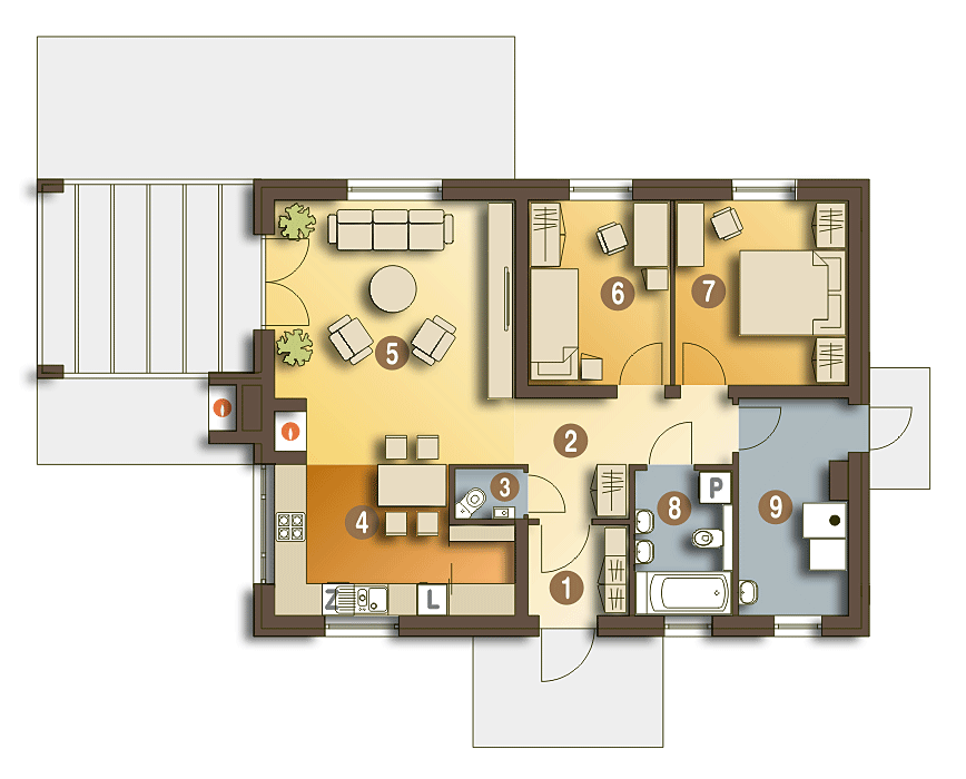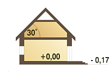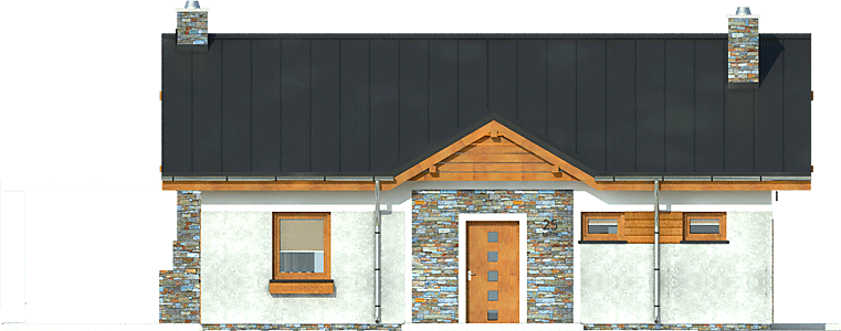 Projekt niewielkiego, nowoczesnego domu jednorodzinnego, parterowego dla 3 do 4 osób. Prosta forma budynku z dwuspadowym dachem zapewnia utrzymanie niskich kosztów budowy. Nieduża powierzchnia domu daje możliwość podziału powierzchni, na część ogólną, w której zaprojektowano salon z kominkiem, kuchnią ze spiżarnią i wydzieloną toaletą oraz cześć prywatną z dwoma pokojami i łazienką. W projekcie przewidziano kotłownię na piec na paliwo stałe, co pozwoli zaoszczędzić na kosztach ogrzewania domu.