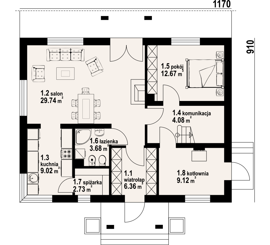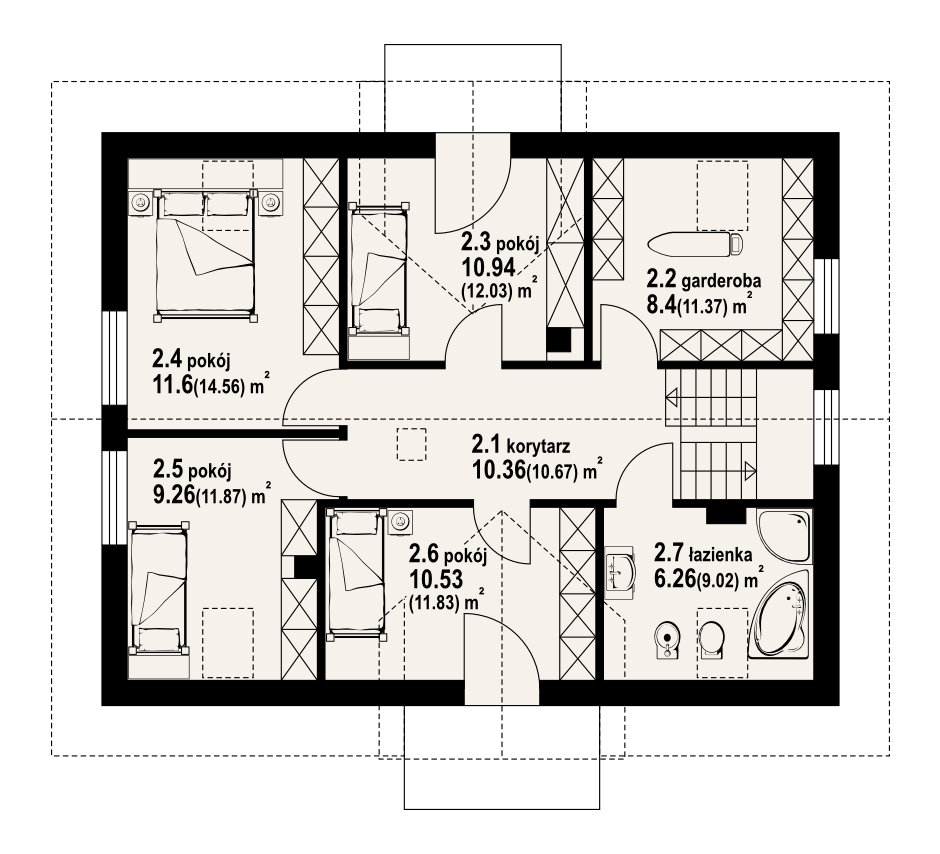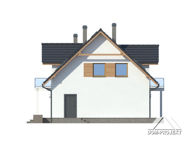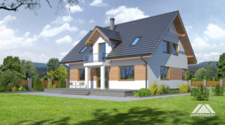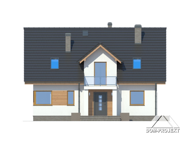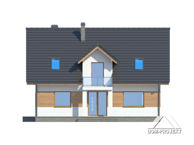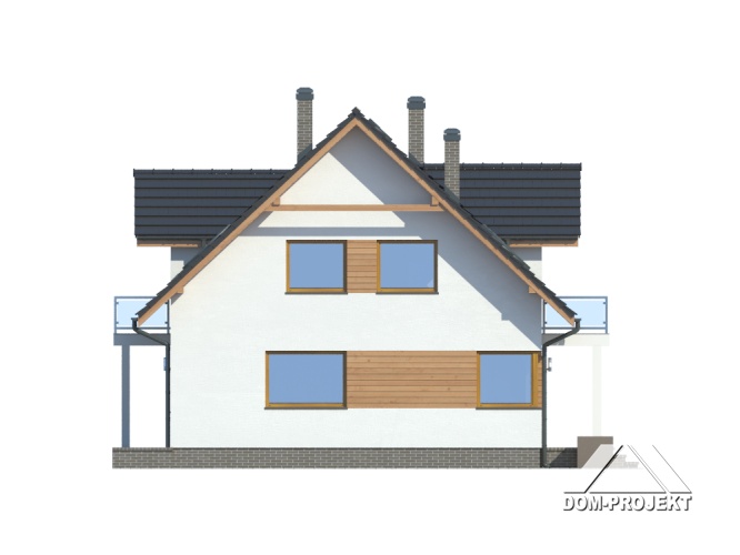 Ładny dom z poddaszem użytkowym, którego układ funkcjonalny zaprojektowano z myślą o 4-5 osobowej rodzinie. Przewidziano dla niej cztery sypialnie, łazienkę i dużą garderobę na poddaszu oraz dodatkowy pokój na parterze, która może być również wykorzystany jako gabinet. Na parterze znajdziemy także przestronny pokój dzienny, częściowo wydzieloną kuchnię, ze spiżarnią oraz kotłownię. Dom ten wyróżniają wyważone proporcje i elegancki detal architektoniczny.