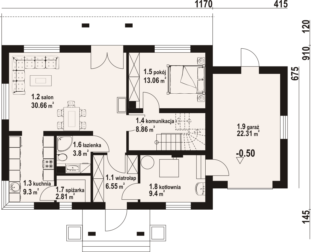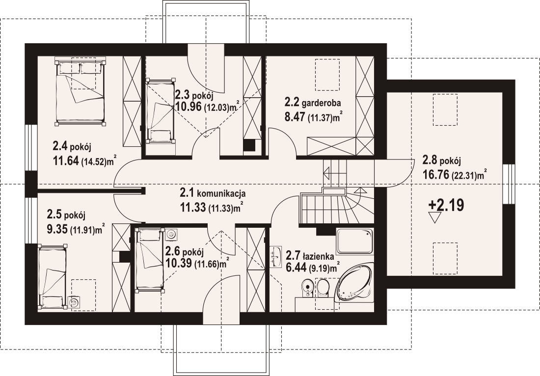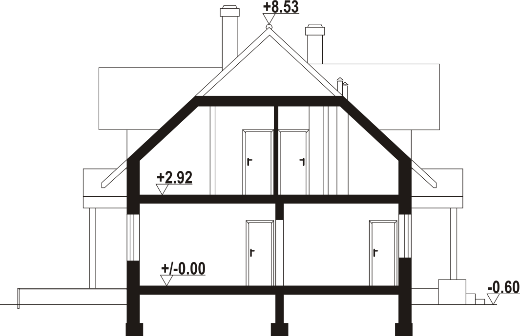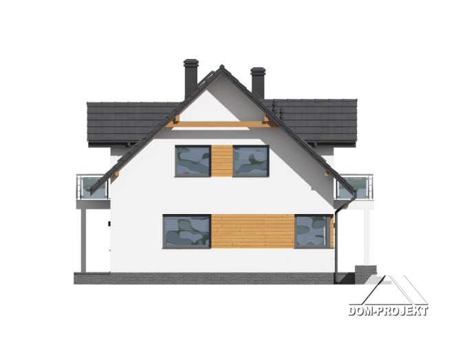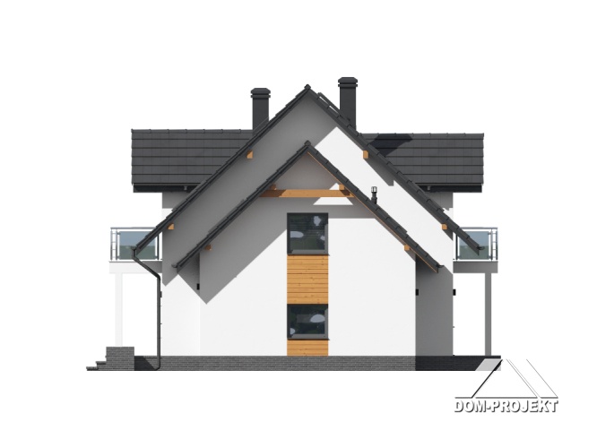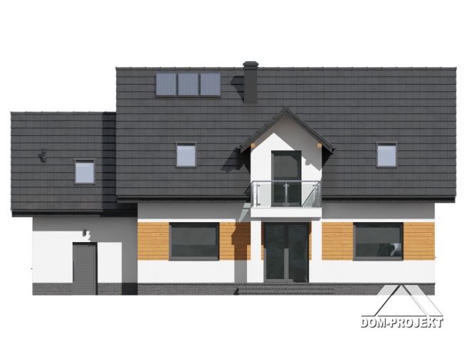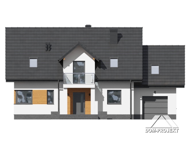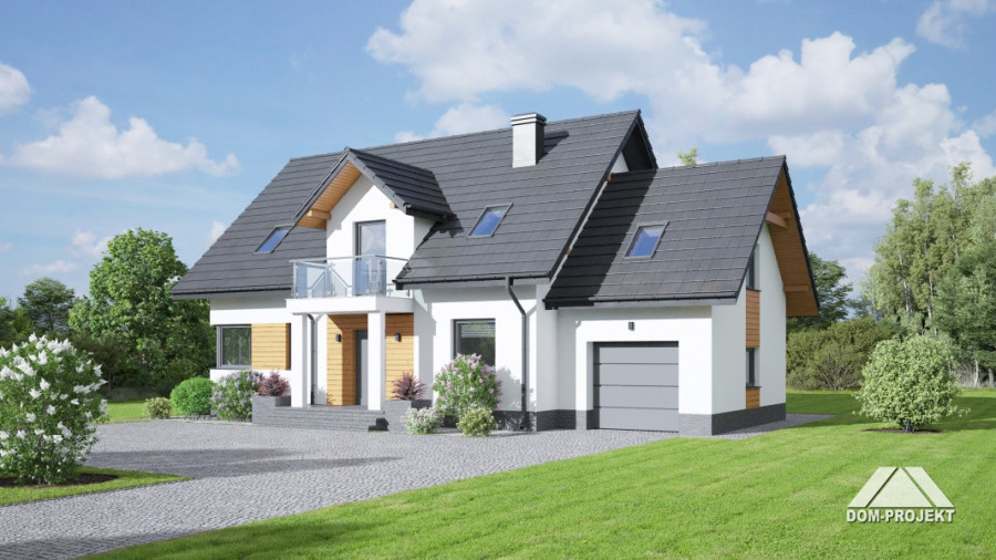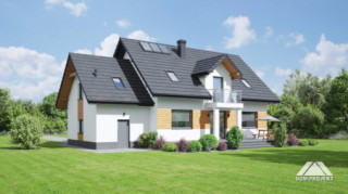 Przyjemny dom o prostej bryle i dobrych proporcjach architektonicznych. Na parterze salon z kominkiem posiadający bezpośrednie połączenie z kuchnią. Z kuchni dostępna spiżarka. Dodatkowy pokój na parterze może pełnić funkcję sypialni lub gabinetu. Ponadto na parterze zaprojektowano łazienkę i kotłownię, oraz dostępny z niej jednostanowiskowy garaż. Na poddaszu znajdziemy aż pięć przestronnych sypialni, dużą garderobę i łazienkę.