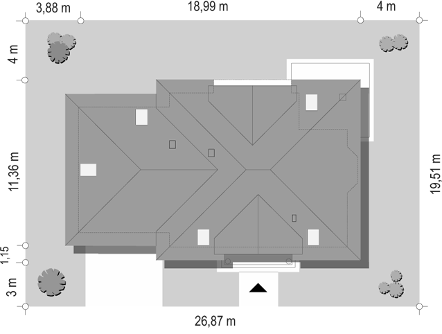 Nawet mały dom parterowy, zaprojektowany energooszczędnie na planie zwartego prostokąta z dobudowanym garażem, nie uniknie wydłużonych proporcji. Projekt domu Milan jest zbliżony układem i wielkością do Lilaka czy Bytomira, ale proponuje inny sposób kształtowania takiej formy z dwuspadowym dachem. Część mieszkalną urozmaica wejściowa wnęka, a garaż z kotłownią mają zwężony trakt i chowają się za główną bryłę dzięki cofniętym elewacjom i niższej kalenicy. Plan mieszkania dzieli wzdłuż na połowy ściana nośna. Trzy sypialnie z dwoma łazienkami to standardowe rozwiązanie w tej wielkości domach, ale projekt domu Milan zwraca uwagę wyjątkowo przestronnym pokojem dziennym. Otwarty salon z kominkiem połączony jest z bardzo dużą kuchnią, która, przez przechodnią spiżarnię, dostępna jest też z sieni. Wygodna strefa wejściowa zmienia się z holu w przedpokój części prywatnej, zamknięty na końcu pralnią i przejściem do garażu. Rysunek drzwi i okien Milana jest swobodny i dostosowany do optymalnego doświetlenia pomieszczeń. Dla uporządkowania kompozycji elewacji zaproponowano w wizualizacji pasy drewnianej boazerii zewnętrznej.